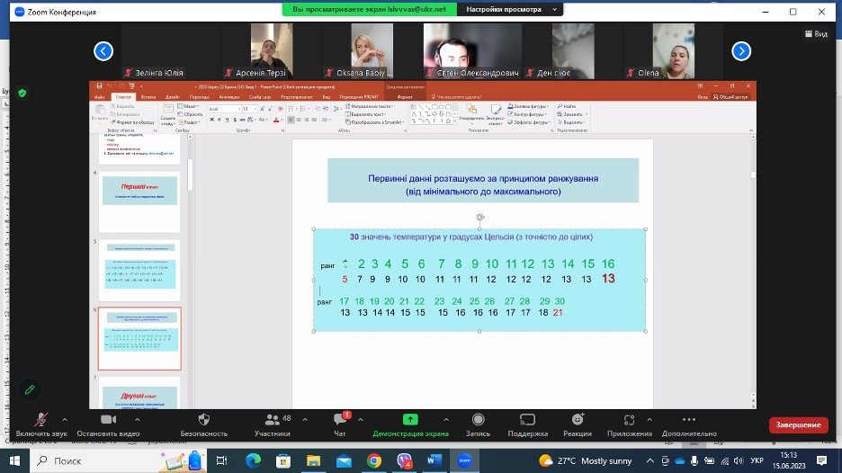 Були розглянути питання: емпіричний розподіл, угрупування даних, інтервал угрупування, нормальний розподіл (розподіл Гауса) тощо. Зустріч була продуктивною і стимулювала жваве обговорення запропонованого матеріалу, аспіранти і наукові керівники отримали вичерпні відповіді на свої запитання.