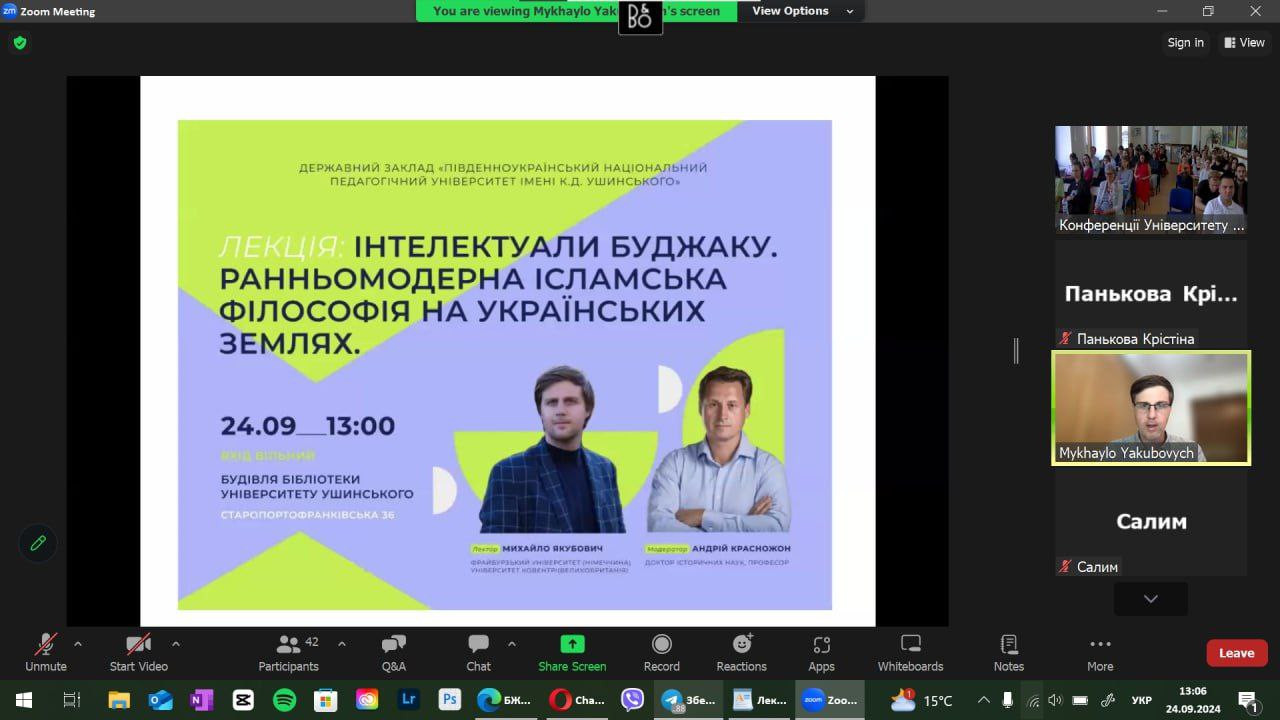 24 вересня 2024 року студенти ОПП «Початкова освіта» 1-го року навчання, члени студентського наукового гуртка «Південноукраїнські наукові студії» разом із викладачем філософії проф. Оксаною Петіновою у змішаному форматі відвідали захопливу лекцію відомого філософа, історика, дослідника Михайла Якубовича на тему «Інтелектуали Буджаку. Ранньомодерна ісламська філософія на українських землях», яка була проведена в науковій бібліотеці Університету Ушинського. Організатор та модератор заходу – ректор Університету, проф. Андрій Красножон.