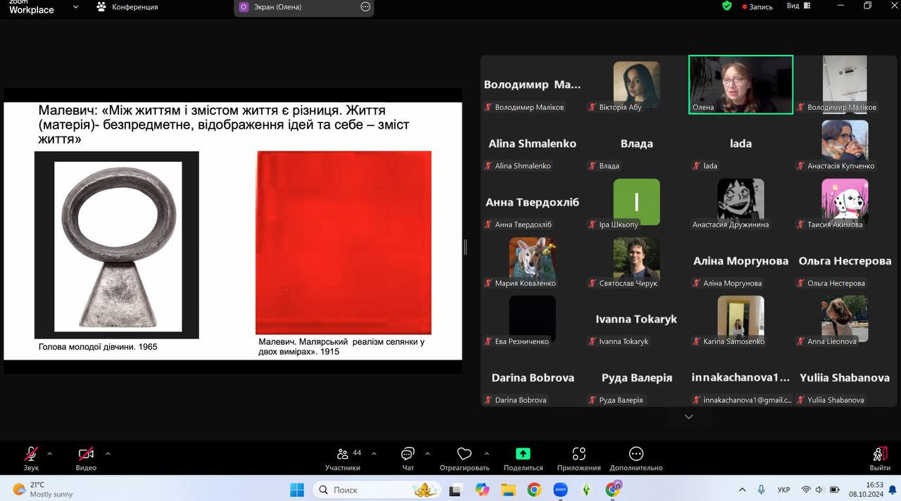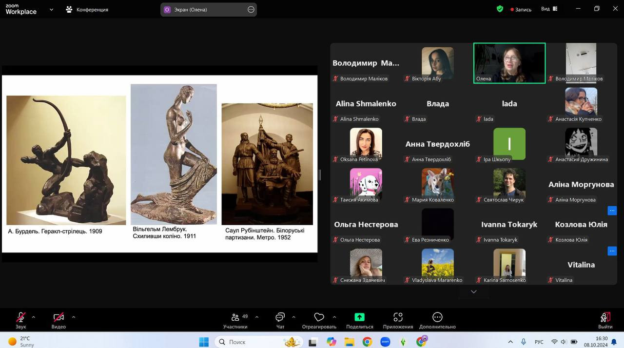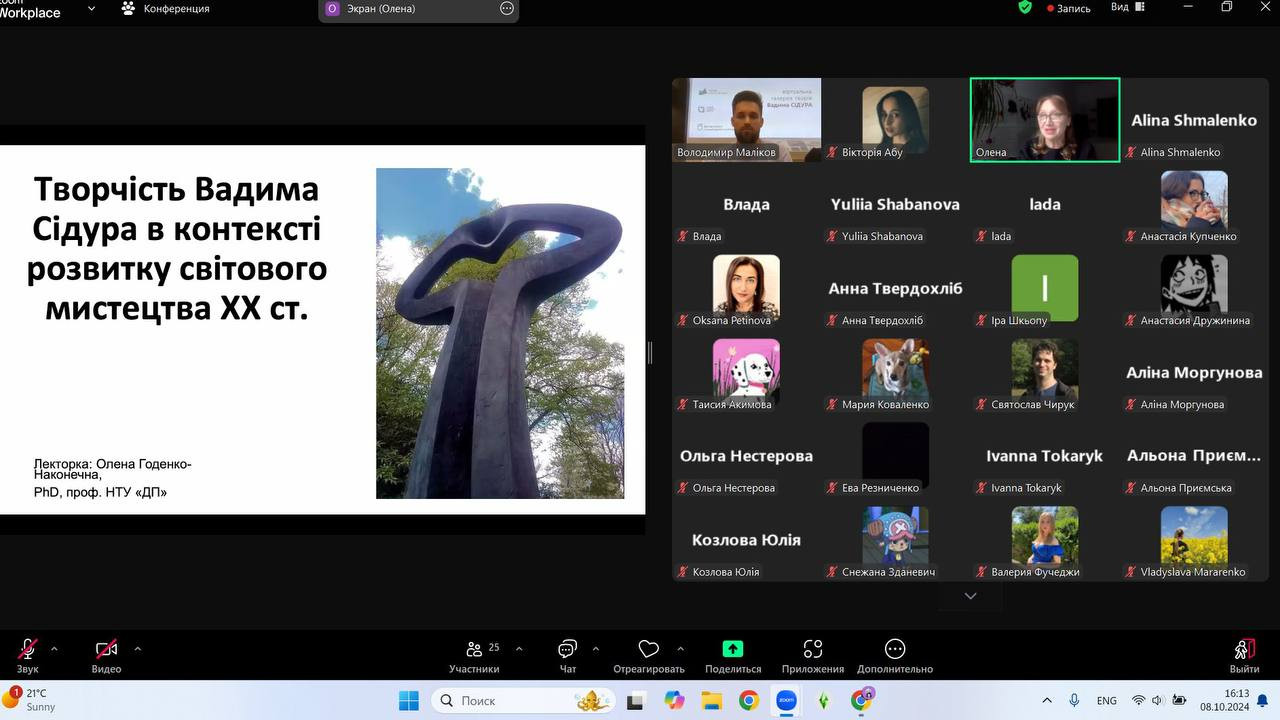 «Я відчуваю себе класиком, що завершує велику епоху….» (Сідур). Відбулася унікальна авторська онлайн-лекція мистецтвознавиці, культурологині, Phd, професорки НТУ «Дніпровська політехніка» (ЗВО-партнер) Олени Годенко-Наконечної «Творчість Вадима Сідура в контексті розвитку світового мистецтва», що проходила в НДЦ «Інститут світової культури», Дніпровська академія музики (ЗВО-партнер), керівниця центру - проф. Юлія Шабанова.Захід організовано в рамках проєкту «Мистецтво пам’ятати». Послухати унікальну інформацію та прийняти участь в обговоренні доєдналися також і студенти 1го року навчання ОПП «Початкова освіта», члени студентського наукового гуртка «Південноукраїнські наукові студії» разом із викладачем філософії проф. Оксаною Петіновою, керівницею гуртка. Лекція, присвячена життю та творчості видатного дніпровського скульптора, стала важливою подією для всіх, хто цікавиться мистецтвом, філософією мистецтва та соціокультурними процесами. У своєму виступі Олена детально розкрила особливості творчого шляху митця, торкнулася теми його непростої долі та представила глибокий аналіз новаторських робіт. Обговорювали скульптури, що поєднують архаїчні форми та модерністські ідеї, створюючи унікальні візуальні образи, архаїчні мотиви як джерело натхнення митця та роль цієї естетики в творчості Вадима Сідура, надзвичайно вразило присутніх мистецтво "Гроб-арт" як новаторський напрям, що викликає емоційний резонанс і змушує замислитися про життя, смерть і вічність.