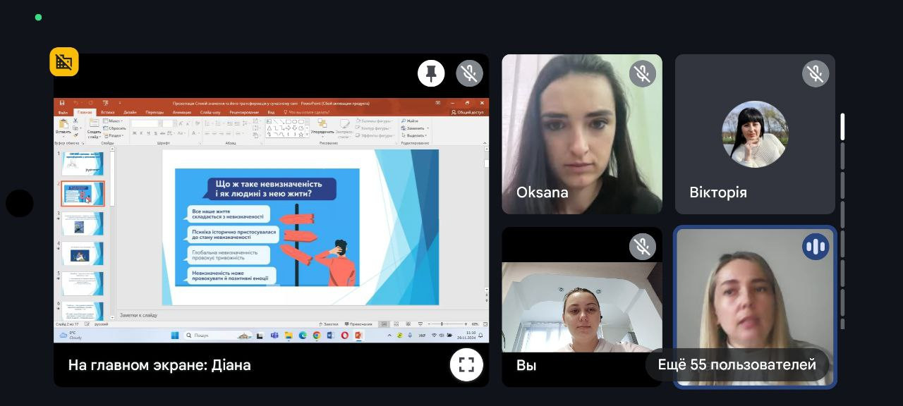 29 листопада о 11.00 студенти ОПП «Початкова освіта. Практична психологія» за спеціальністю 013 Початкова освіта за першим (бакалаврським) рівнем вищої освіти відвідали гостьову лекцію Дроздової Діани Сергіївни, кандидата психологічних наук, доцента кафедри психології Горлівського інституту іноземних мов ДВНЗ «Донбаський державний педагогічний університет» (м. Дніпро) з теми «Спокій: значення та його трансформація у сучасному світі».