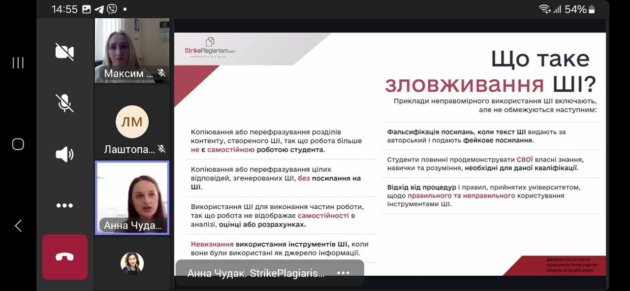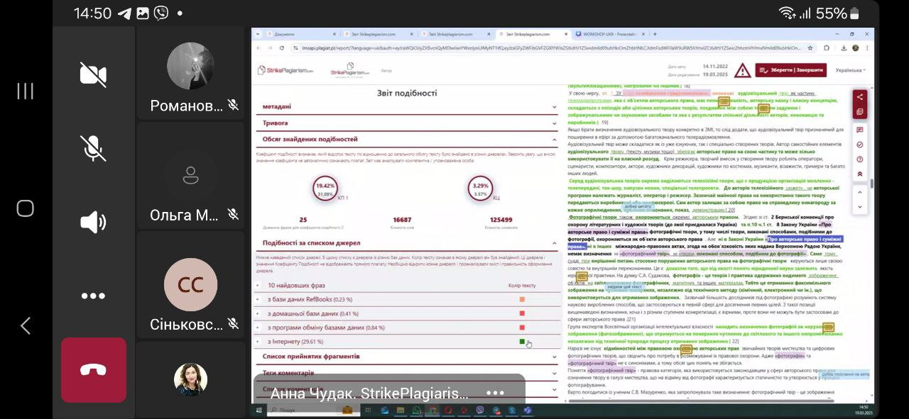 19 березня 2025 року здобувачі 4-го року навчання спеціальності 013 «Початкова освіта» заочної форми навчання долучилися до вебінару «Перевірка на плагіат як інструмент академічної доброчесності: аналіз звіту подібності + КП ШІ у StrikePlagiarism.com». Захід відбувся в межах «Тижня доброчесності в Університеті Ушинського» та є дотичним до розгляду теми «Соціальні інститути освіти та їх роль у формуванні академічної культури» (ВК «Соціологія», викладач – проф. Петінова О. Б.).Говорили про розуміння етичних стандартів написання наукових робіт; аналізувати критерії оцінки тексту; знайомились з алгоритмами роботи StrikePlagiarism.com та штучного інтелекту в перевірці запозичень. Учасники отримали практичні навички роботи із системою StrikePlagiarism.com, роз’яснення щодо оцінки текстів на плагіат та використання штучного інтелекту для перевірки доброчесності робіт. Захід розпочався з вітального слова Оксани МАКСИМ, директорки бібліотеки, Голови Групи сприяння доброчесності в Університеті Ушинського, яка наголосила на важливості академічної доброчесності в освітньому процесі. Спікерка – Анна ЧУДАК, менеджер з розвитку plagiat.pl (https://plagiat.pl/) в Україні. Активна дискусія підкреслила важливість таких заходів для формування культури доброчесності серед здобувачів вищої освіти. Активну участь в обговоренні теми взяли Клименко Марина, Лаштопа Анна, Романова Дарія, Мединська Ольга. Академічна доброчесність – основа якісної освіти та наукової діяльності!
