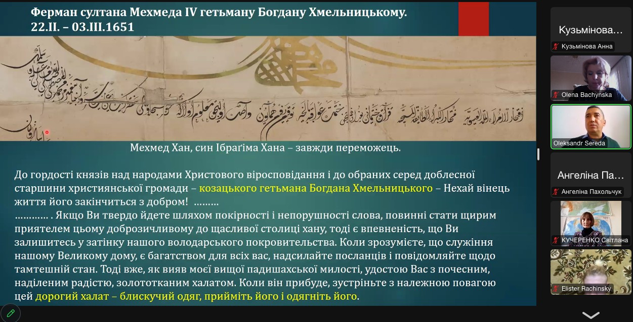 Тема презентованої доповіді загалом розкриває питання ролі османського впливу в українському державотворенні на основі аналізу представлених османсько-турецьких джерел гетьманської доби. Зокрема акцентовано увагу на ферманах султана Мехмеда IV до Богдана Хмельницького, Петра Дорошенка, і султана Ахмеда ІІІ до Пилипа Орлика. Представлено підтвердження визнання османськими султанами очільників українського суспільства як гетьманів української держави за етнотопонімом «Україна», а не як володарів якоїсь з провінцій іншого сюзерена.