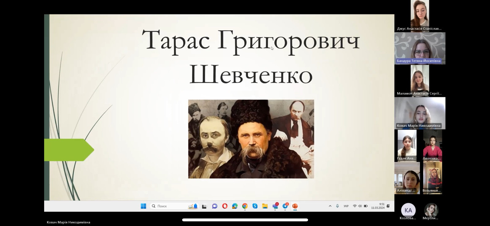 11 березня 2024 року студентками 1 групи 3-го курсу історико-філологічного факультету й куратором Бандурою Т. Й. було проведено онлайн-семінар «Стежками Шевченкової творчості». Цим заходом учасники вшанували пам'ять Великого Кобзаря з нагоди 210-річчя від дня народження митця.Студентки-філологині продемонстрували глибоку повагу генієві Шевченка, підготувавши змістовну презентацію про різножанрову творчість письменника, його малярський здобуток. Юні пошановувачки таланту поета декламували вірші, показуючи неабияке вміння передати емоцію, переживання, відчуття ліричного героя шевченківської поезії. Таким чином організатори й учасники зробили свій внесок у свідомий акт національної й патріотичної самоідентифікації, рупором ідей якої був саме Тарас Григорович Шевченко – честь і гордість українського народу.