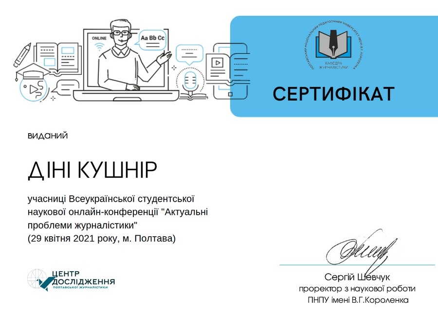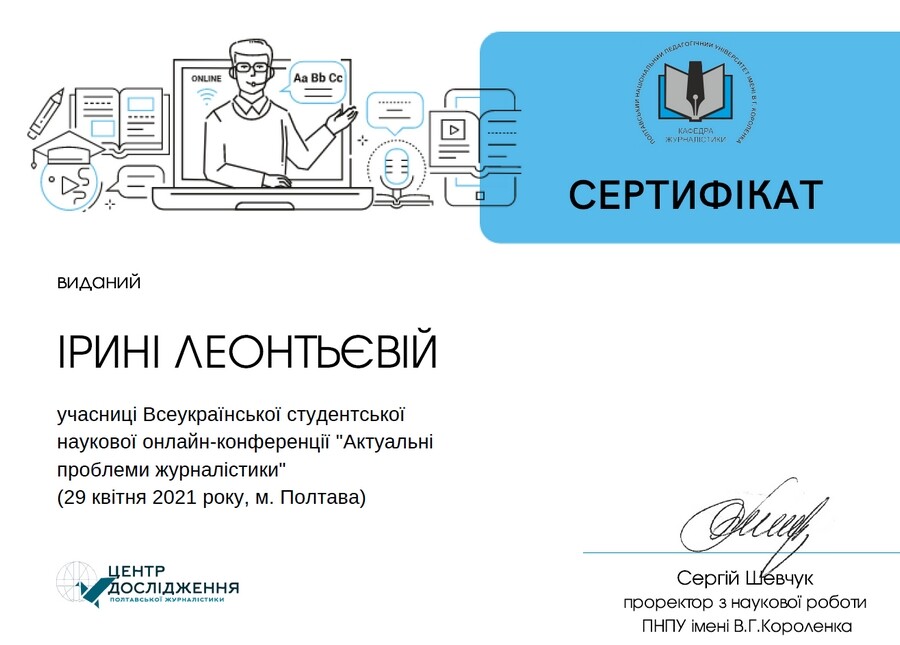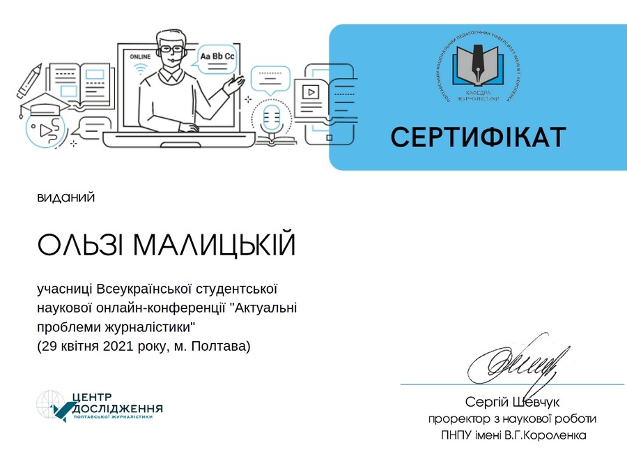 Отож, рухаймося далі. 22 квітня на базі факультету філології та журналістики Полтавського національного педагогічного університету імені В.Г.Короленка в онлайн-форматі на платформі Google Meet відбулася Всеукраїнська студентська наукова конференція «Актуальні проблеми журналістики». Одеську команду доповідачів з філологічного факультету Університету Ушинського на чолі з доцентом кафедри української філології і методики навчання фахових дисциплін Ж.Д. Горіною представили: