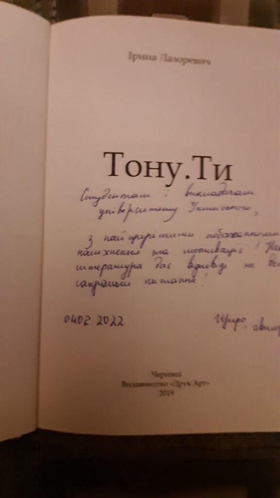 «Студентам і викладачам Університету Ушинського, з найщирішими побажаннями натхнення та мотивації! Нехай література дає відповіді на всі сакральні питання! Щиро, авторка».
