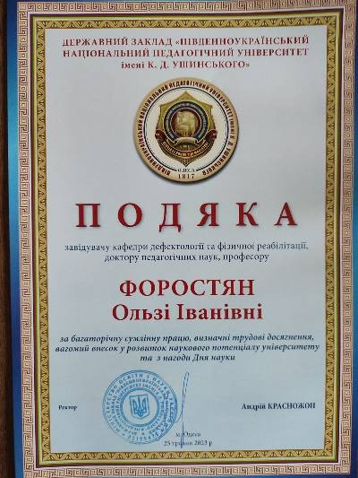 25 травня 2023 року, на засідання вченої ради Університету Ушинського було відзначено подякою за багаторічну сумлінну працю, визначні трудові досягнення, вагомий внесок у розвиток наукового потенціалу університету та з нагоди Дня науки: Форостян Ольгу Іванівну – завідувача кафедри дефектології та фізичної реабілітації, доктора педагогічних наук, професора та Соколову Ганну Борисівну – доктора психологічних наук, професора кафедри дефектології.