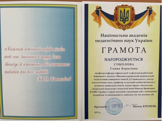 Соколову Ганну Борисівну - доктора психологічних наук, професора кафедри дефектології та фізичної реабілітації нагороджено Грамотою Національної Академії Педагогічних Наук України за вагомий особистий внесок у розвиток спеціальної освіти, плідну працю з Інститутом спеціальної педагогіки і психології імені Миколи ярмаченка НАПН України у справі навчання і виховання осіб з особливими потребами та самовідданість, виявлену під час воєнних дій.