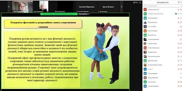 На прикладі наявних досліджень лекторкою було продемонстровано вплив фізкультурних занять з елементами спортивних танців на показники фізичного розвитку, функціонального стану серцево-судинної та дихальної системи, постави, фізичної підготовленості, працездатності дітей шкільного віку.