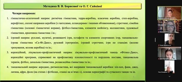 Магістри та викладачі кафедри теорії і методики фізичної культури та спортивних дисциплін, зокрема гарант ОПП 014 Середня освіта (Фізична культура), доктор педагогічних наук, професорка Башавець Н. А., кандидат наук з фізичного виховання та спорту, викладач кафедри гімнастики та спортивних єдиноборств Буховець Б. О., кандидат біологічних наук, доцент, Бондаренко О.В., кандидат філософських наук, доцент кафедри гімнастики та спортивних єдиноборств Погорелова О.О., активно брали участь у обговоренні питань розглянутих під час лекції та висловили щиру подяку шановній Чеверді А.О. за цінний матеріал, який був презентований.