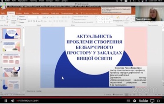 Університет Ушинського представляла Ганна Соколова - в. о. директора навчально-наукового інституту фізичної культури, спорту та реабілітації, доктор психологічних наук, професор, яка виступила на пленарному засіданні з доповідю «Актуальність проблеми створення безбар’єрного простору у закладах вищої освіти».