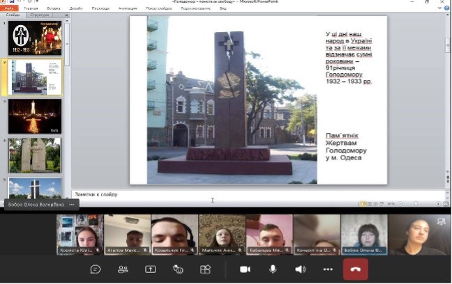 Кожен рік, у четверту суботу листопада країна вшановує пам'ять жертв Голодомору 1932–1933 років. Цього року до щорічного національного пам’ятного дня були залучені студенти Навчально-наукового інституту фізичної культури, спорту та реабілітації спеціальності 014 (Середня освіта) Фізична культура. Навчально-виховний захід було проведено у аудиторії та за допомогою комп’ютерних технологій співробітниками кафедри біології та охорони здоров’я.