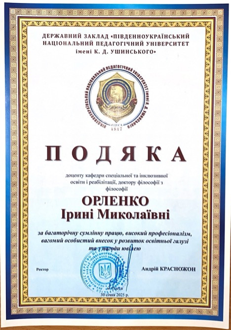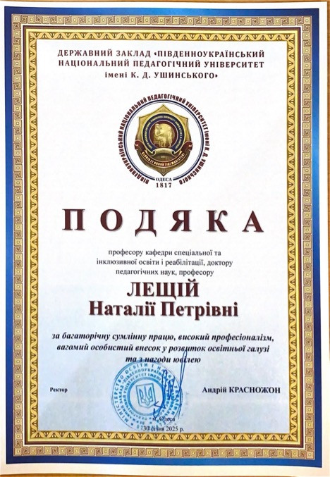 Доктора педагогічних наук, професора кафедри спеціальної та інклюзивної освіти ЛЕЩІЙ Наталію Петрівну та доктора філософії, доцента кафедри спеціальної та інклюзивної освіти ОРЛЕНКО Ірину Миколаївну які отримали ПОДЯКУ за багаторічну сумлінну працю, високий професіоналізм, вагомий особистий внесок у розвиток освітньої галузі та з нагоди ювілею від ректора Університету Ушинського Андрія Красножона.