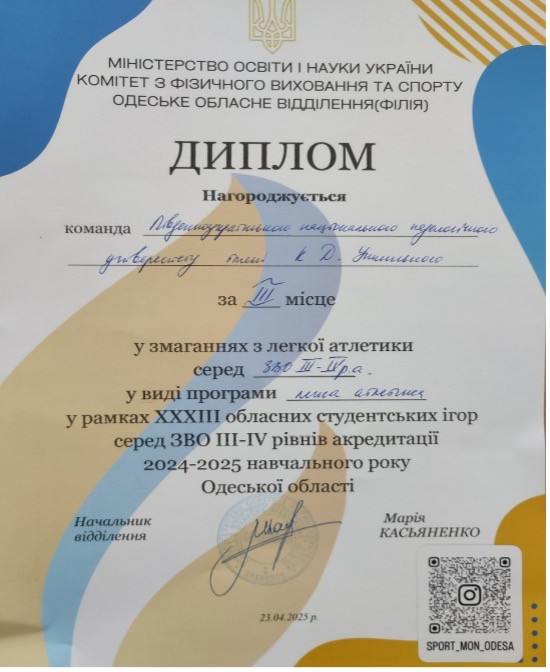 23 квітня 20025 року відбулися змагання з легкої атлетики в рамках ХХХІІІ обласних студентських ігор серед закладів вищої освіти III-IV р. а. Змагання проводилися у легкоатлетичному манежі «Олімпієць» м. Одеси.