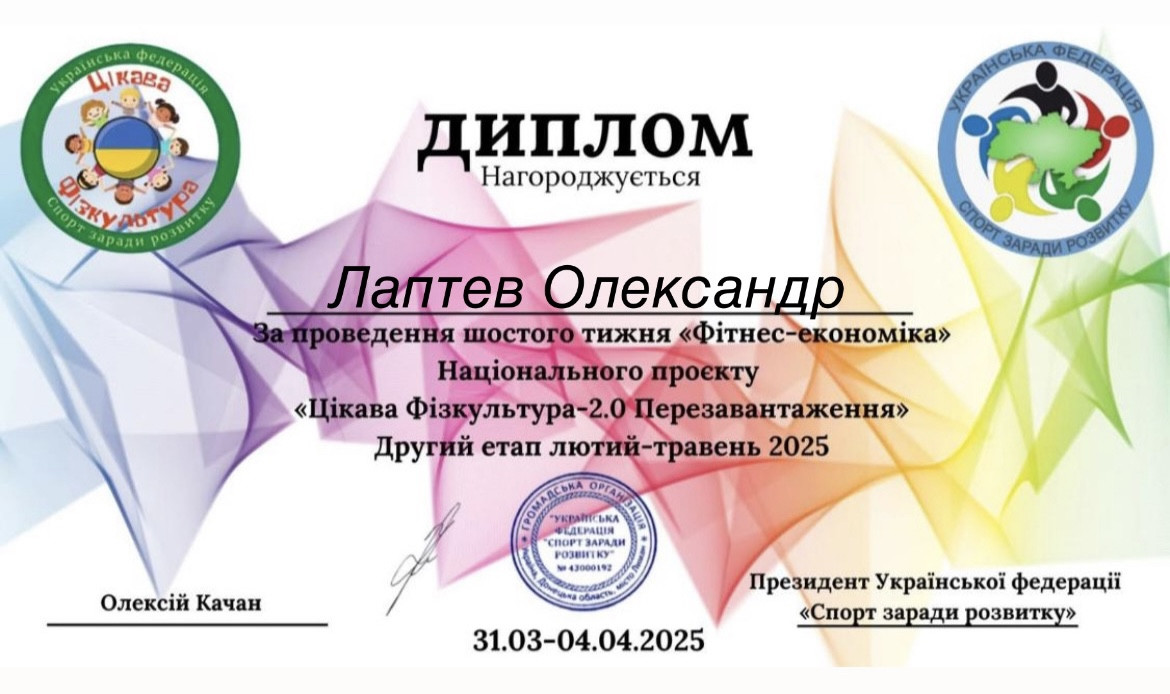 Магістр Лаптев О.О. отримав дипломи за проведення другого тижня «Спорт без кордонів» Національного проєкту «Цікава Фізкультура-2.0 Перезавантаження» другий етап лютий-травень 2025 та за проведення шостого тижня «Фітнес-економіка» Національного проєкту «Цікава Фізкультура-2.0 Перезавантаження» другий етап лютий-травень 2025 року.