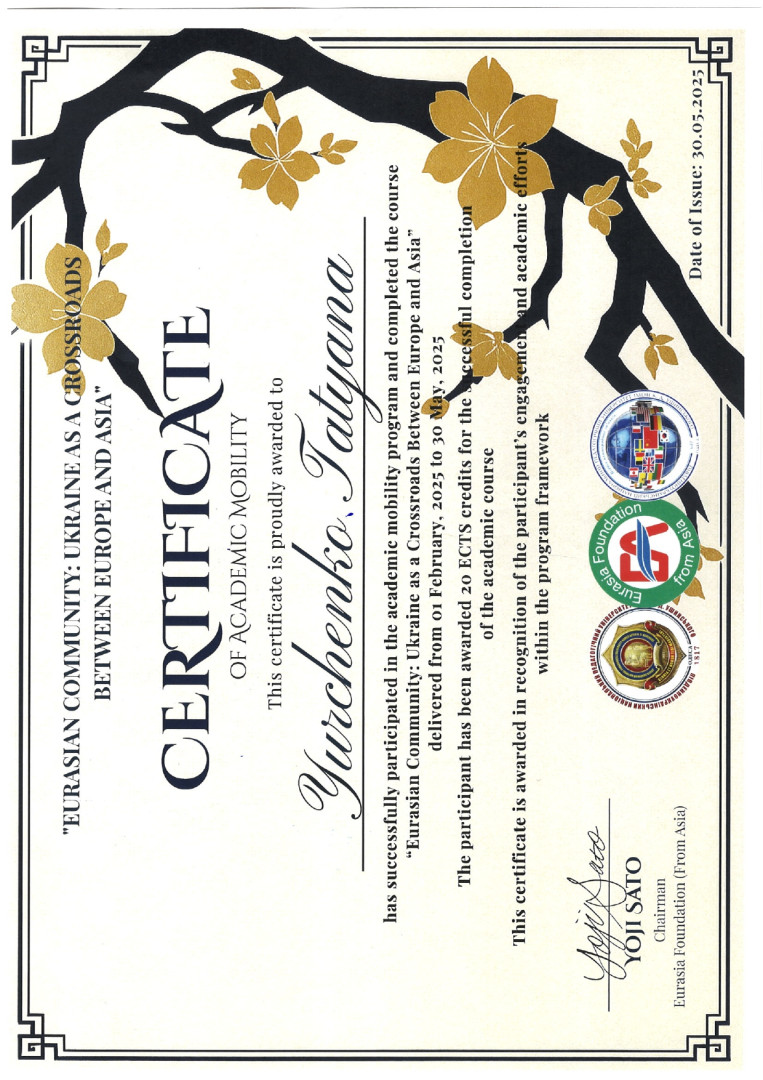 Юрченко Тетяна Олександрівна здобувачка вищої освіти за другим (магістерським) рівнем ОПП Середня освіта (Фізична культура) денної форми навчання успішно завершила участь у програмі академічної мобільності для опанування міжнародного досвіду та доступу до європейської та світової дослідницької роботи (Фонд Євразії, Азія) за проєктом: «Євразійська спільнота: Україна як шлях Європи та Азії» з 01.02.2025 по 31.05.2025 року, що сприяє розширенню наукових горизонтів та інтеграції України у міжнародний освітньо-науковий простір.