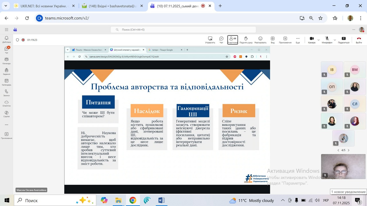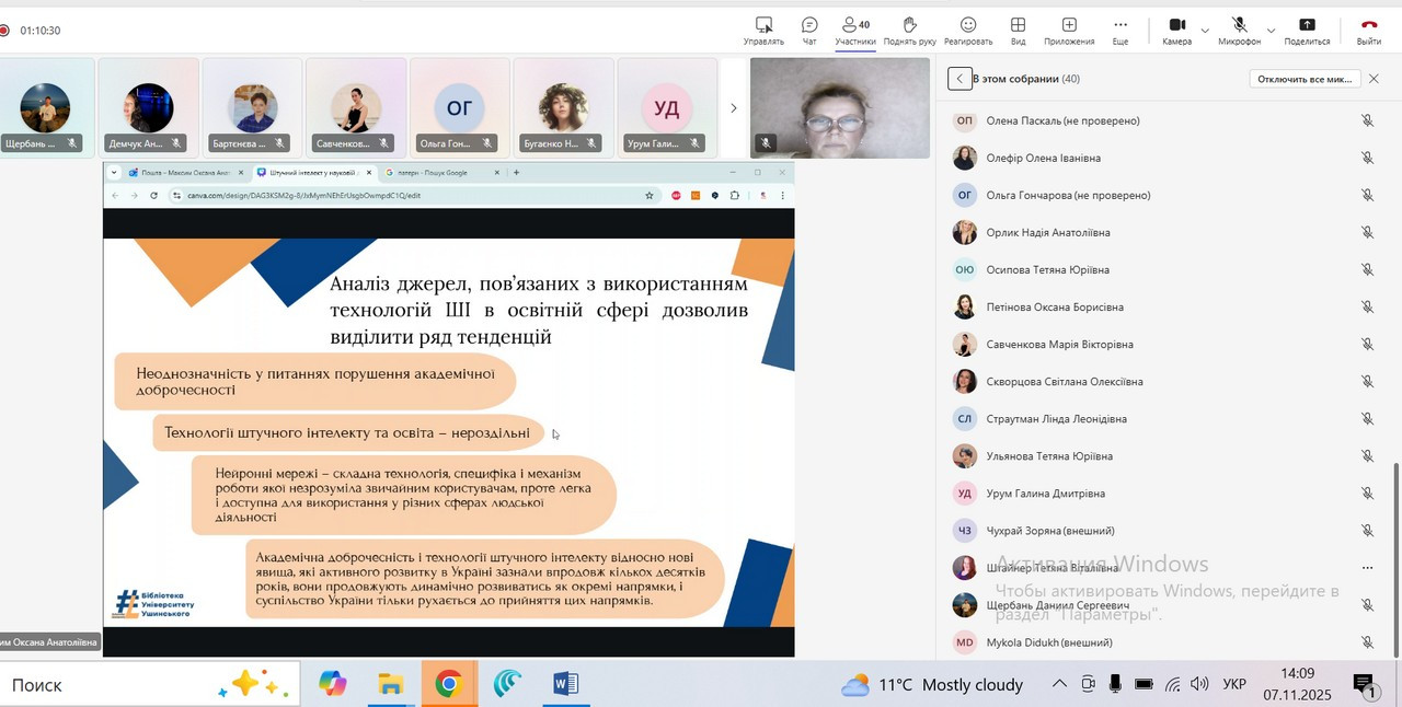 7 листопада 2025 р. здобувачі вищої освіти, які навчаються за другим (магістерським) рівнем ОПП Середня освіта (Фізична культура) відвідали лекцію з теми «ШІ у науковій діяльності: як не порушувати академічну доброчесність», яку проводила директор бібліотеки Університету Ушинського Максим Оксана.