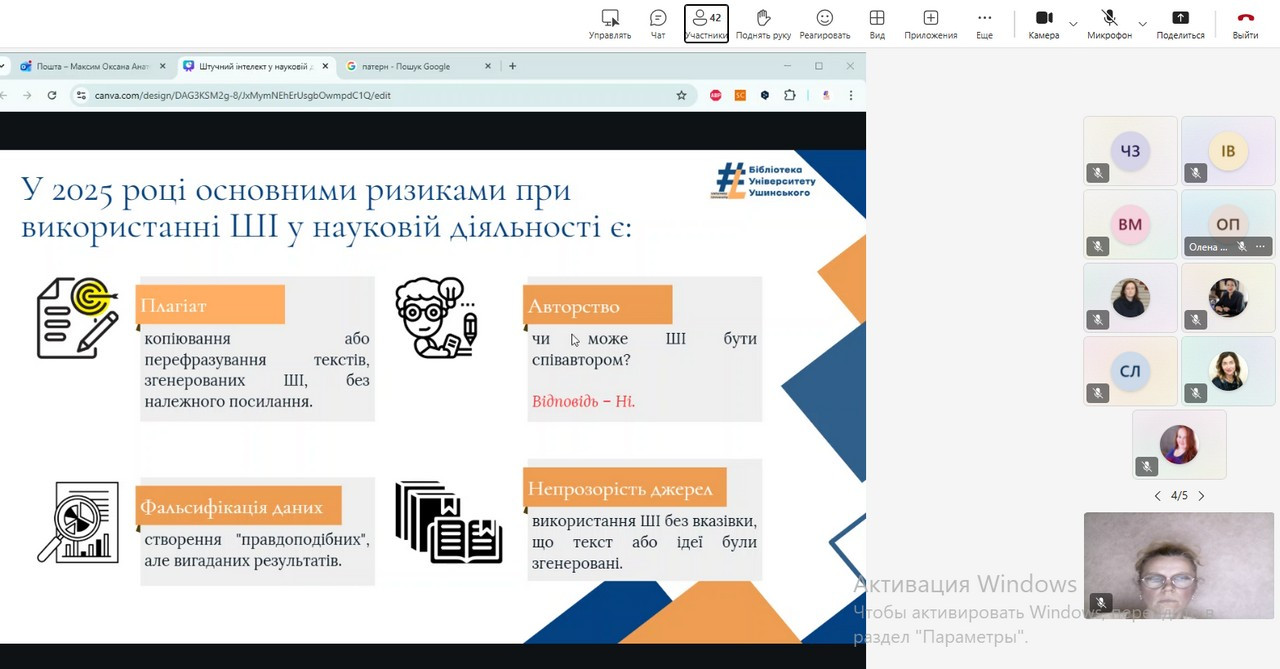 У межах лекції розглядалися основні напрями застосування ШІ в науковій діяльності, переваги та потенційні ризики його використання. Окрему увагу приділено етичним аспектам взаємодії з інтелектуальними системами, правилам посилання на матеріали, створені за допомогою ШІ, та практичним рекомендаціям щодо забезпечення прозорості й відповідальності в наукових роботах.