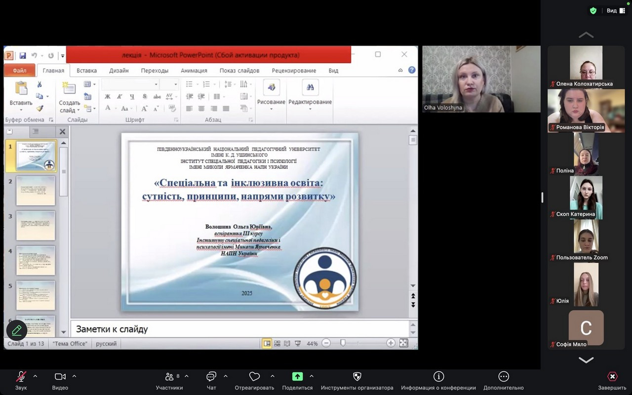 14.11.2025 н. р. в межах договору про співпрацю для здобувачів першого року навчання за другим (магістерським) рівнем освітньо-професійної програми «Спеціальна освіта (Логопедія)» в рамках дисципліни «Актуальні проблеми та методологія спеціальної та інклюзивної освіти», Волошина Ольга Юріївна, аспірантка, наукова співробітниця відділу компаративістики та міжнародних наукових звʼязків Інституту спеціальної педагогіки і психології імені Миколи Ярмаченка НАПН України провела відкриту лекцію на тему «Спеціальна та інклюзивна освіта: сутність, принципи, напрями розвитку».