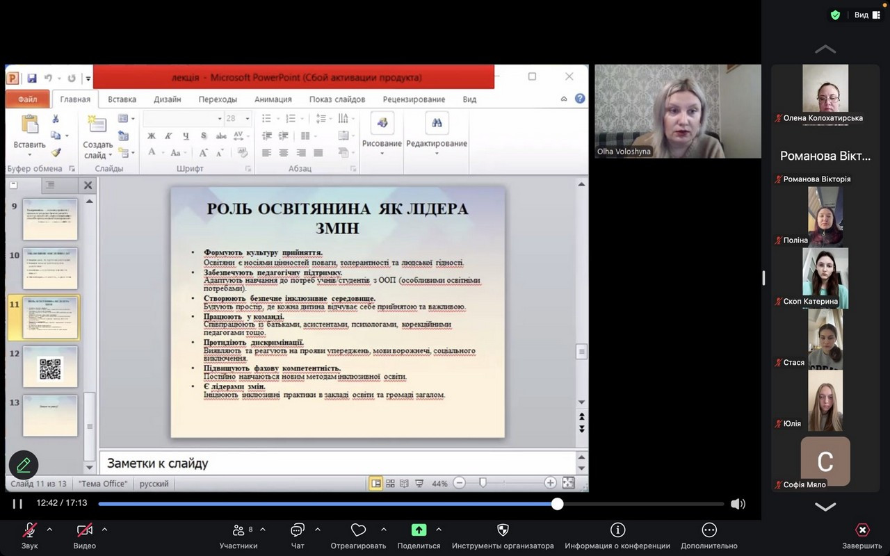 У лекції були розглянуті питання щодо бар’єрів та викликів в інклюзивній освіті, розгортались принципи та перспективи напрямів розвитку.