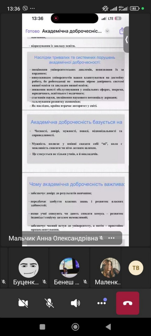 У ході заходу також було висвітлено можливі наслідки недотримання норм академічної доброчесності, серед яких – зниження академічної репутації, анулювання результатів навчання, дисциплінарна відповідальність, а також втрата довіри до результатів наукової діяльності. Наголошено, що дотримання етичних норм є невід’ємною складовою професійного становлення майбутніх фахівців у сфері фізичної культури і спорту.