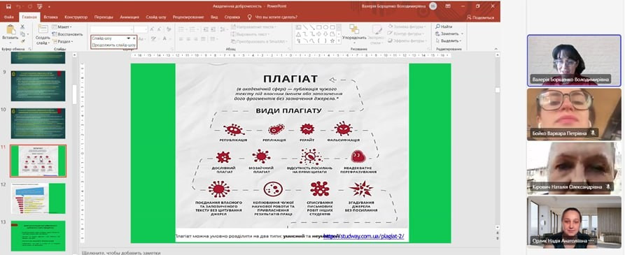 20 березня відбувся захід у рамках Тижня доброчесності, який провіла доцент кафедри біології та здоров’язбережувальних технологій Борщенко В. В. для магістрантів першого року навчання спеціальності А4.15 «Середня освіта (Природничі науки)» було організовано аналітичну дискусію «Інтелектуальна власність і доброчесність: правовий та етичний вимір наукової діяльності магістра».