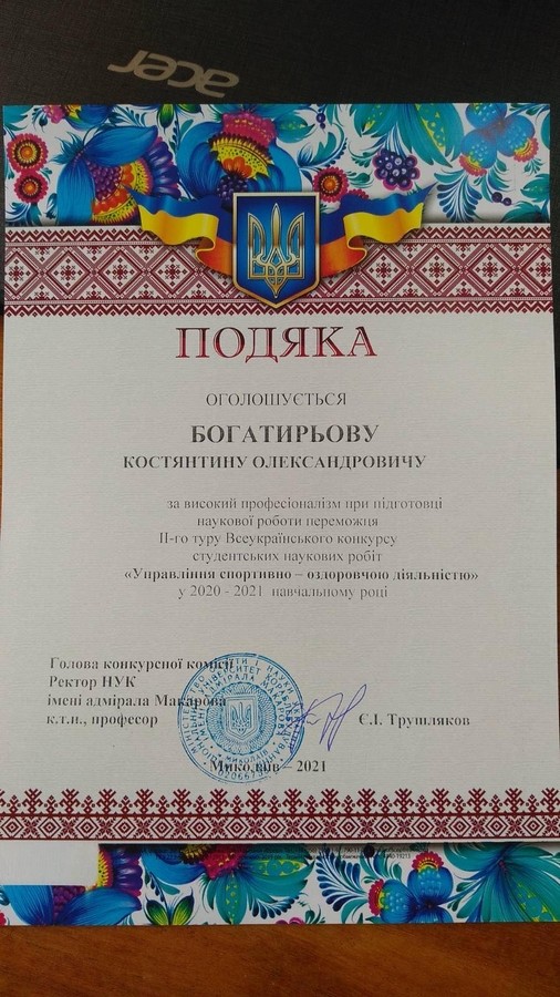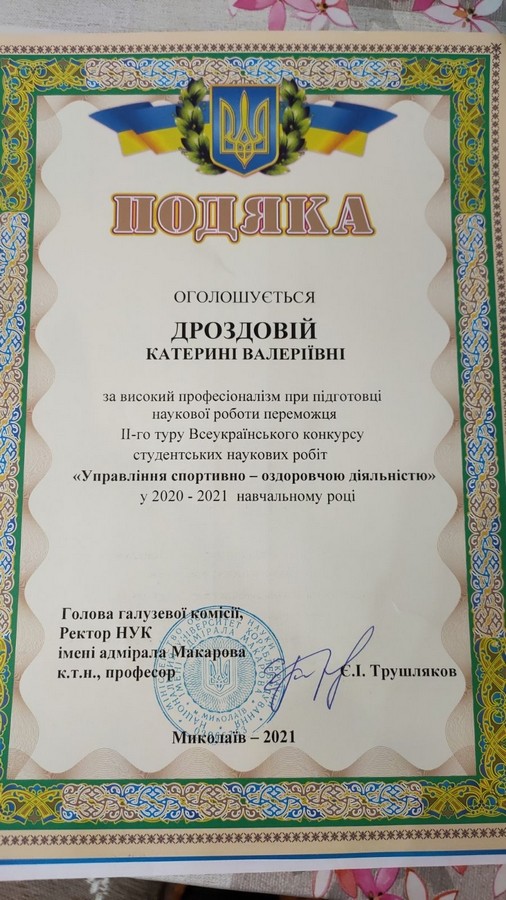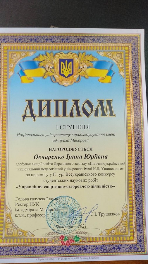 6 квітня 2021 року у м. Миколаєві відбувся 2 тур Всеукраїнського конкурсу студентських наукових робіт «Управління спортивно-оздоровчою діяльністью». За результатами конкурсу диплом третього ступеня отримал Пересунько Павло Юрийович, студент 1 року навчання здобувач вищої освіти за першим (бакалаврським) рівнем за спеціальністю 014 Середня освіта (Фізична культура) Навчально-наукового інституту фізичної культури, спорту та реабілітації Університету Ушинського з роботою «Формування пріоритетів у використанні здоров’язбережувальної педагогічної технології з фізичної культури на основі врахування особливостей розвитку дітей 7-9 років». Науковий керівник: кандидат педагогічних наук, старший викладач кафедри теорії і методики фізичної культури та спортивних дисциплін Дроздова Катерина Валеріївна. Вітаємо наших студентів та їх керівників, з побажанням наступних перемог!