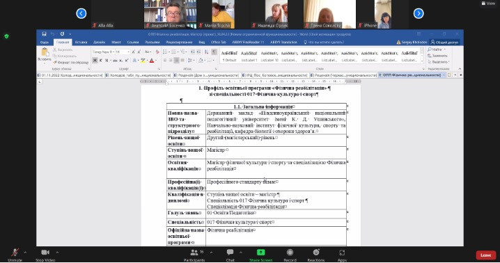 10 квітня 2023 року на розширеному засіданні кафедри біології і охорони здоров’я Університету Ушинського відбулося громадське обговорення проєкту освітньо-професійної програми Фізична реабілітації другого (магістерського) рівня вищої освіти. Після привітального слова завідувача кафедри, кандидата біологічних наук, Марії Сергіївни Топчій, гарант Сергій Анатолійович Холодов, доктор педагогічних наук, доцент, приват-професор кафедри біології і охорони здоров’я представив проєкт освітньо-професійної програми. Він докладно зупинився на компетентностях, програмних результатах навчання і освітніх компонентах, які їх забезпечуватимуть. В обговоренні прийняли участь стейголдери: Володимир Сергійович Лизогуб, доктор педагогічних наук, професор, професор кафедри анатомії, фізіології і фізичної реабілітації Черкаського національного університету імені Богдана Хмельницького; Алла Василівна Бурлака, директор КУ «Одеський інклюзивно-ресурсний центр № 8», Оксана Юріївна Костюк, директор Медико-корекційного центру «Лепрекон+», які висловили свою думку щодо актуальності даної освітньої програми, грамотного її оформлення, а також надали пропозиції задля покращення якості забезпечення освітньої програми. Додатково мали змогу виступити співробітники кафедри, а також науково-педагогічні працівники університету.