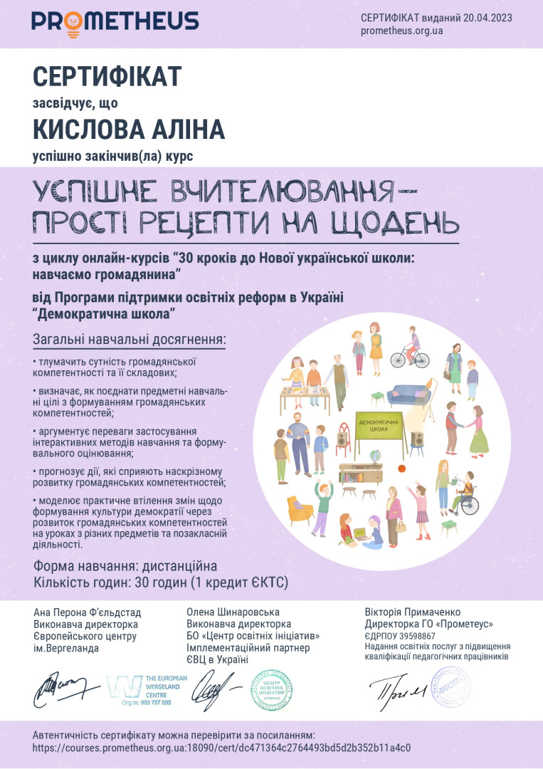 Настаченко Дар'я успішно закінчила курс «Наука про навчання: що має знати кожен вчитель?» teachers college (Колумбійський університет, США), Кислова Аліна успішно закінчила курс «Успішне вчителювання – прості рецепти нащодень», Долга Катерина успішно закінчила курси «Шкільне життя онлайн», “Цифрові інструменти google для освіти” різного рівня Магістрантки протягом березня та квітня 2023 року пройшли навчання на освітній платформі «Прометеус» з отриманням сертифікатів та перезарахували результати навчання з відповідних тем в межах ОК 11 «Методологічні аспекти підготовки вчителів фізичної культури».