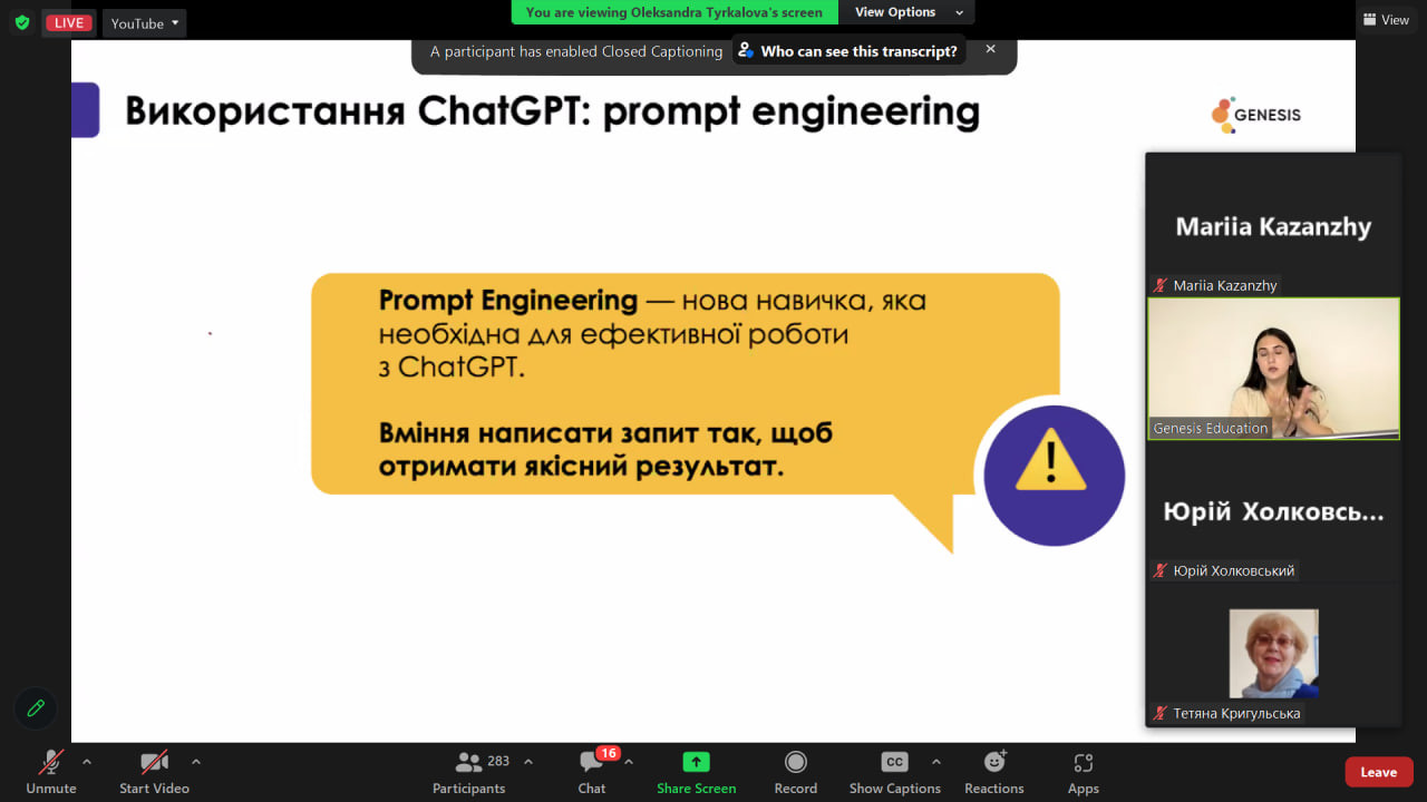 20 червня 2023 року гарант, науково-педагогічні працівники та здобувачі ОНП Психологія прийняли участь у воркшопі «Як ChatGPT може асистувати під час створення навчальної програми або освітньої траєкторії» від Олександри Тиркалової, Partnership with Universities Lead у Genesis.