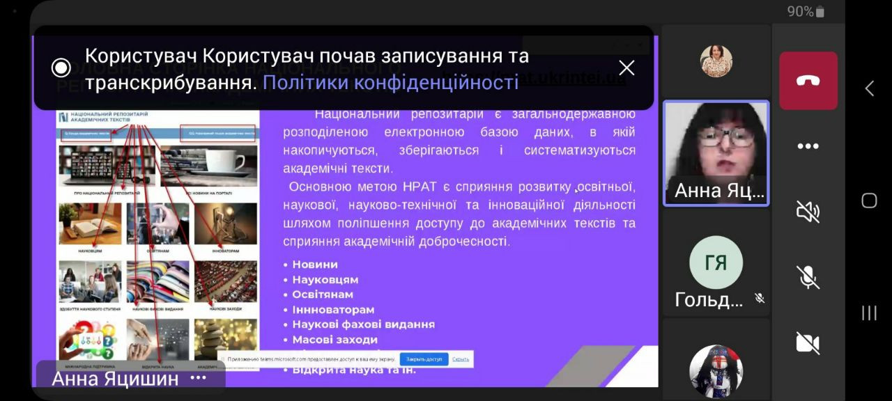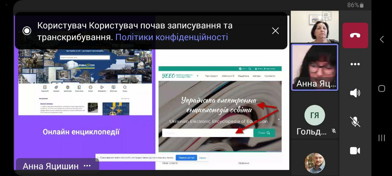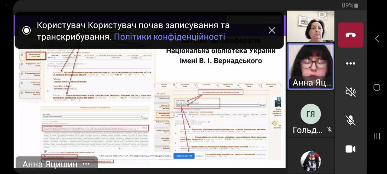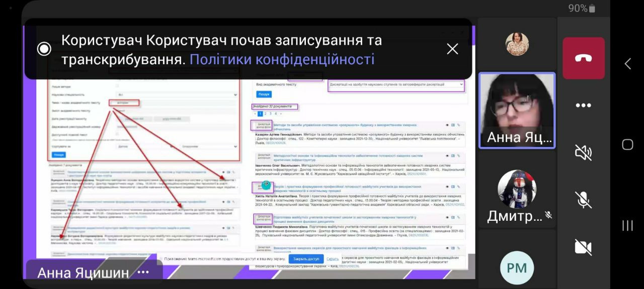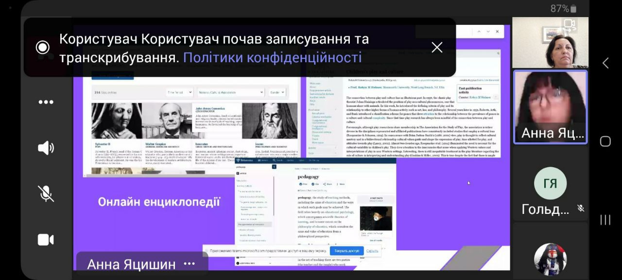 02 жовтня 2023 року здобувачі третього (освітньо-наукового) рівня вищої освіти ОНП «Філософія» (Людмила Городнюк, Ігор Семенов, Ігор Усатюк, Інна Федорова, Елеонора Бутенко), Гарант ОНП проф. Оксана Петінова, наукові керівники аспірантів взяли участь у корпоративному навчанні "Цифрові технології та інструменти відкритої науки для виконання наукового дослідження". Спікерка вебінару – д. пед. н., старший науковий співробітник, завідувачка сектору формування баз даних наукових видань та заходів УкрІНТЕІ Анна ЯЦИШИН. Захід проведено в межах співпраці між Університетом Ушинського та УкрІНЕІ і спрямовувано на ознайомлення молодих науковців із сучасними технологіями пошуку джерел інформації для підготовки власних дисертаційних досліджень, користування сучасними цифровими технологіями для комунікації з науковою спільнотою та науковим керівником.