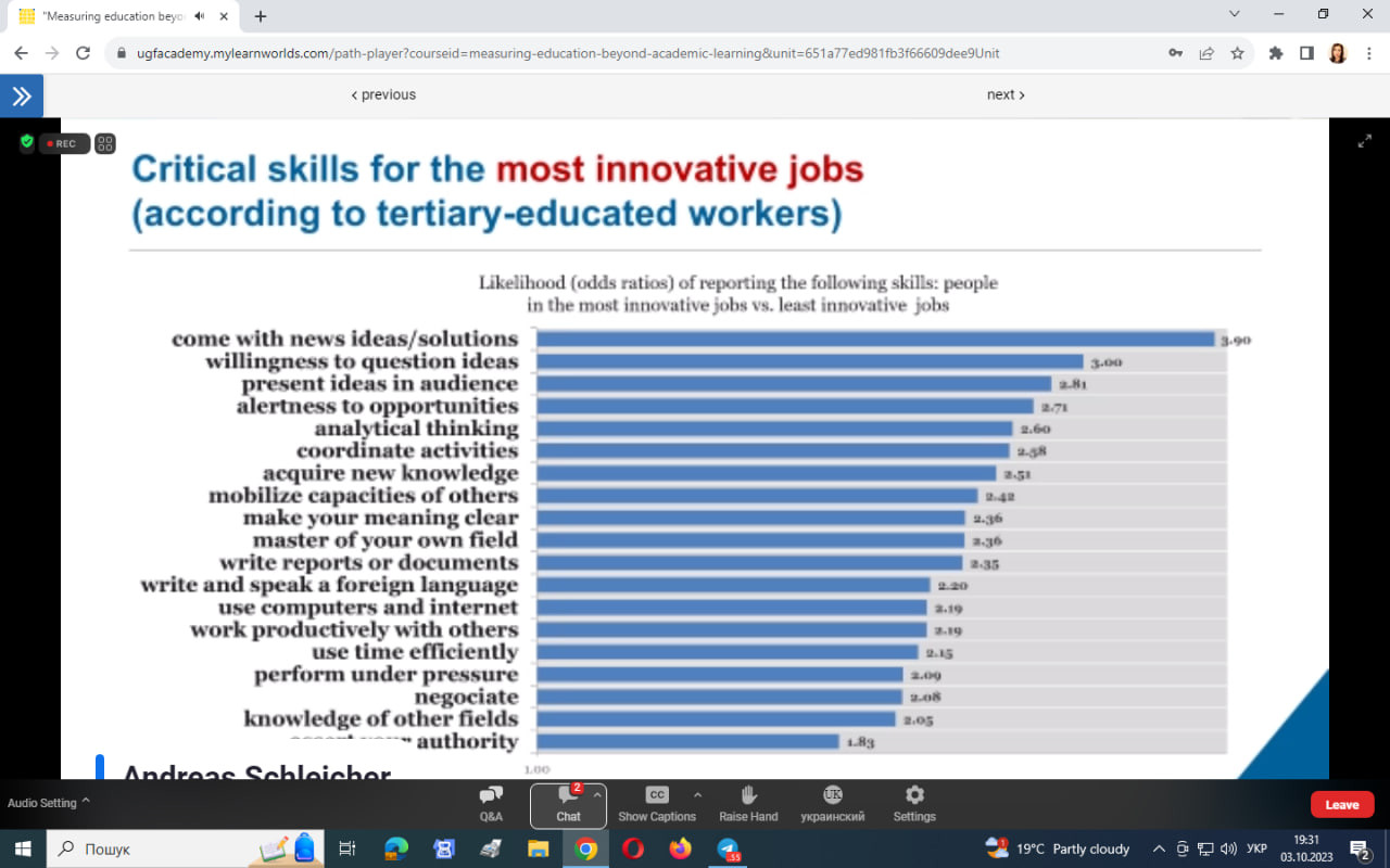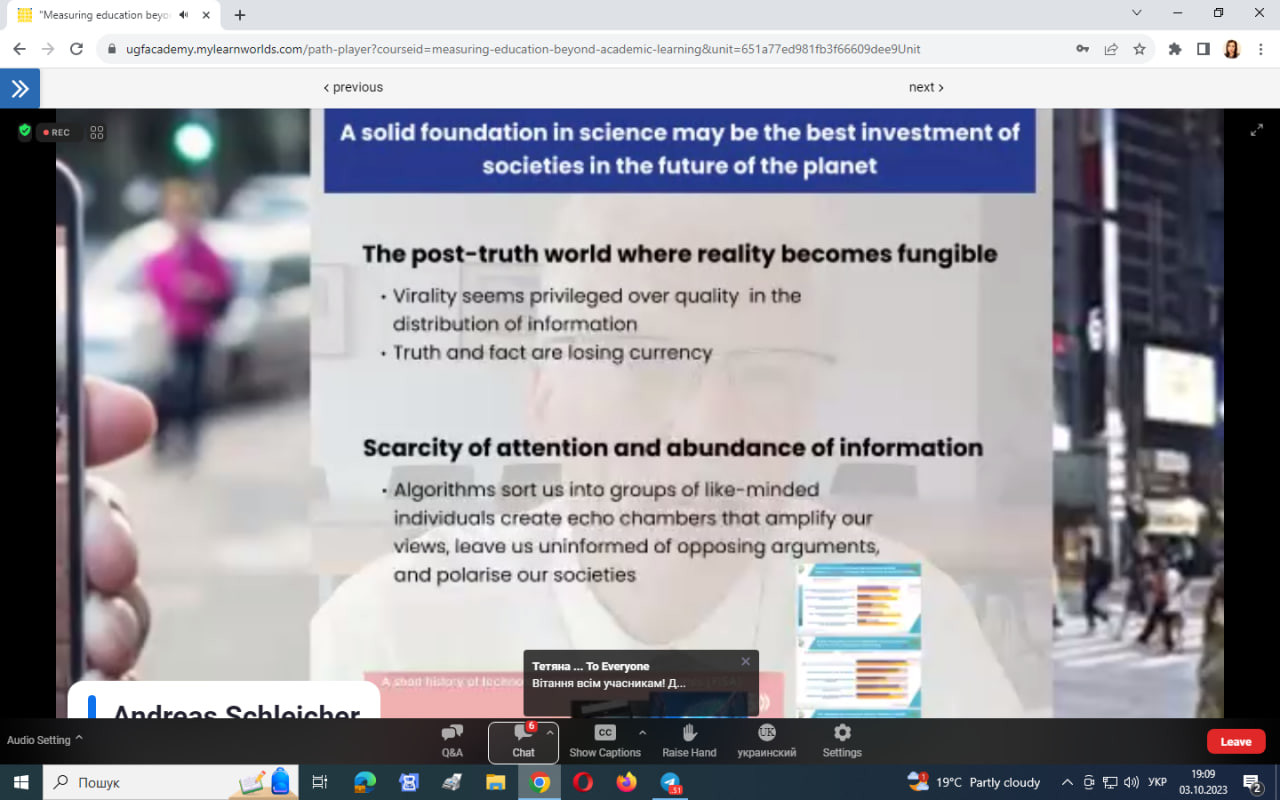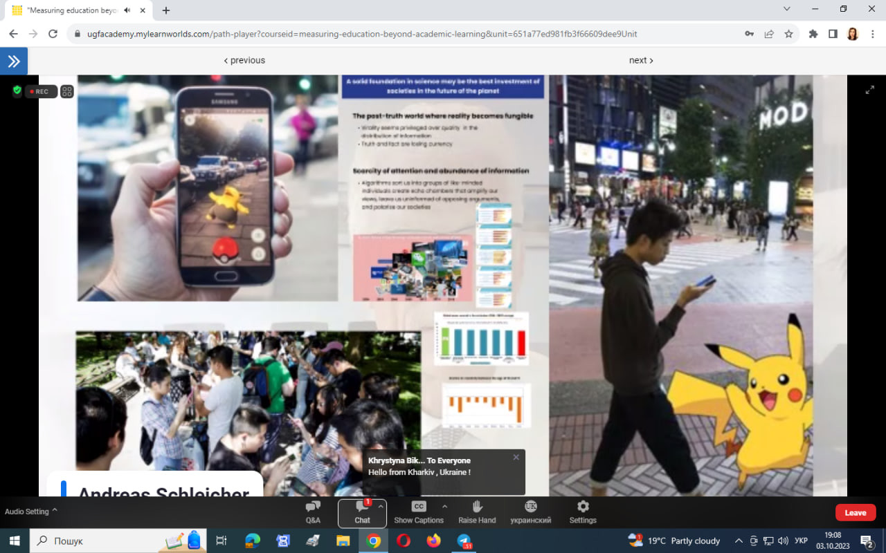 3 жовтня 2023 року науково-педагогічні працівники кафедри філософії, соціології та МСКД і здобувачі третього (освітньо-наукового) рівня вищої освіти ОНП «Філософія» доєдналися до онлайн-лекції «Measuring education beyond academic learning».Спікер – директор з питань освіти та компетенцій Організації економічного співробітництва та розвитку (ОЕСР), почесний професор Гейдельберзького університету Andreas Schleicher. Організатор заходу – Ukraine Global Faculty (UGF). Говорили про сучасні глобальні тенденції в освіті, про необхідність зміни освітньої парадигми, перегляду програми навчання, цифрові навички, формування компетенцій, які знадобляться в житті та на практиці. Дискутували про роль гуманітарних та технічних дисциплін, моделювали перспективи розвитку освіти майбутнього. Питання, що підіймалися, є надзвичайно актуальними в умовах глобальних трансформаційних процесів при підготовці викладачів ЗВО.