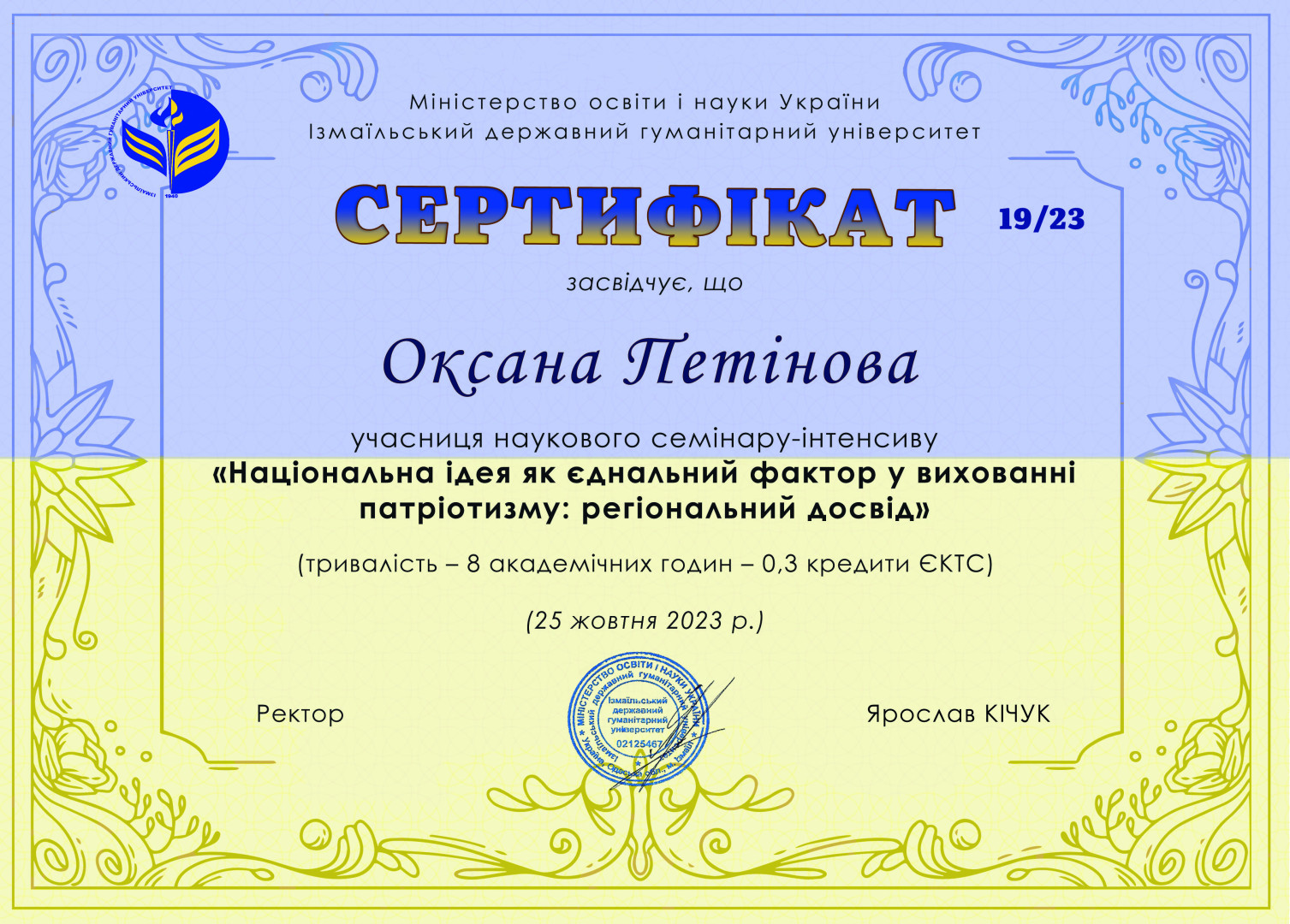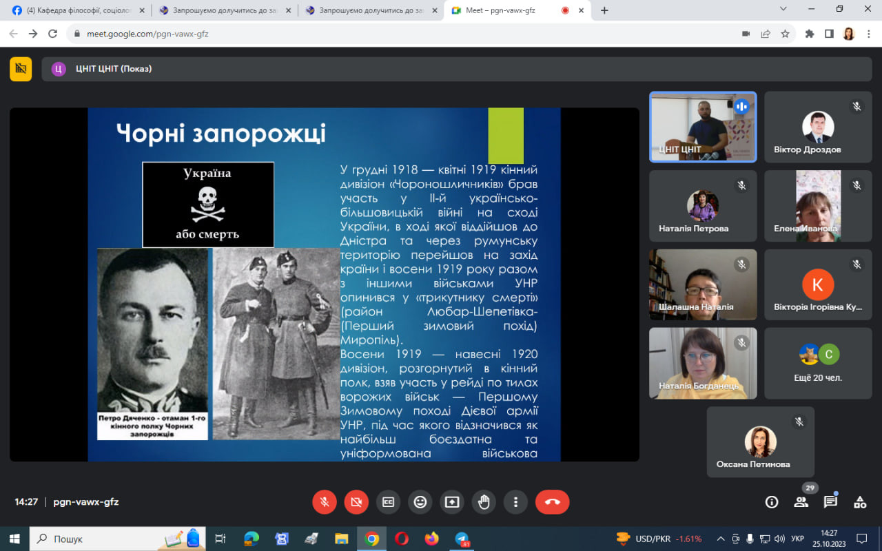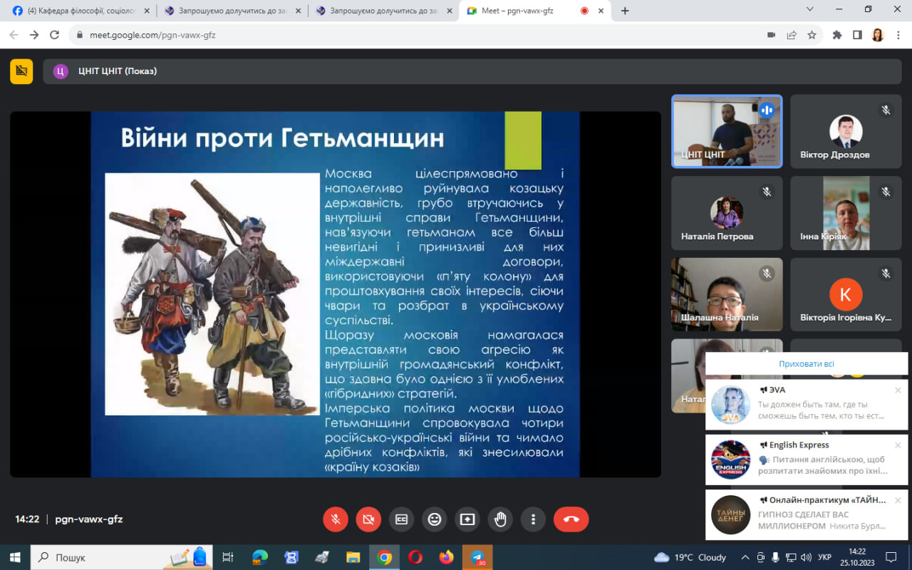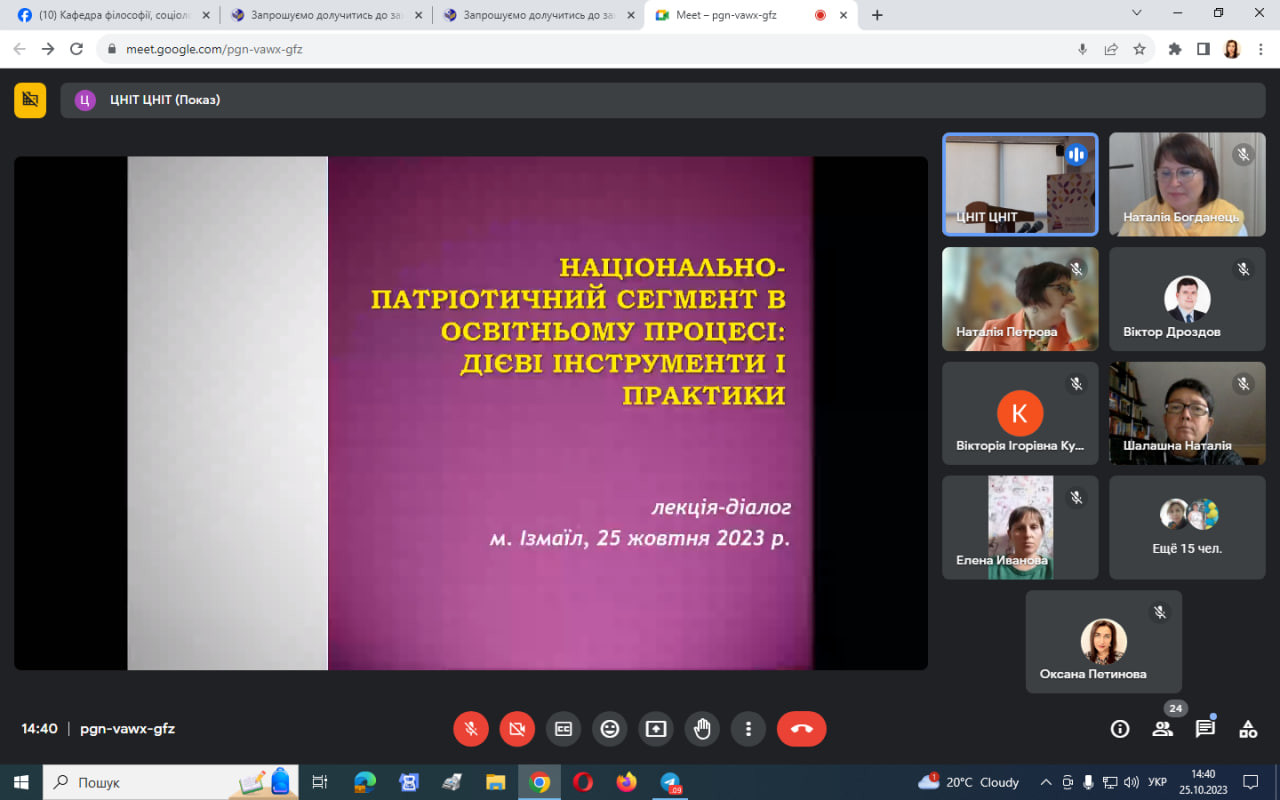 Громадянська освіта та національно-патріотичне виховання є важливою складовою підготовки сучасного фахівця, особливо в наш час. Сьогодні науково-педагогічні працівники, аспіранти та студенти, члени студентського наукового гуртка «Південноукраїнські наукові студії» мали можливість долучитись до наукового семінару-інтенсиву «Національна ідея як єднальний фактор у вихованні патріотизму: регіональний досвід», який проведений на базі Ізмаїльського державного гуманітарного університету в змішаному форматі.Мали змогу прослухати та обговорити проблемну лекцію «Подолання радянських міфів як чинник розвитку національної ідентичності: освітній вимір» (доц. Віктор Дроздов), майстер-клас «Відкриті лекції з історії як одна з форм національно-патріотичного виховання в умовах війни: досвід ІДГУ» (доц. Іван Татаринов); долучитися до лекції-діалогу «Національно-патріотичний сегмент в освітньому процесі: дієві інструменти і практики» (доц. Наталія Гончарова), подискутувати щодо міфів про історію українського козацтва.