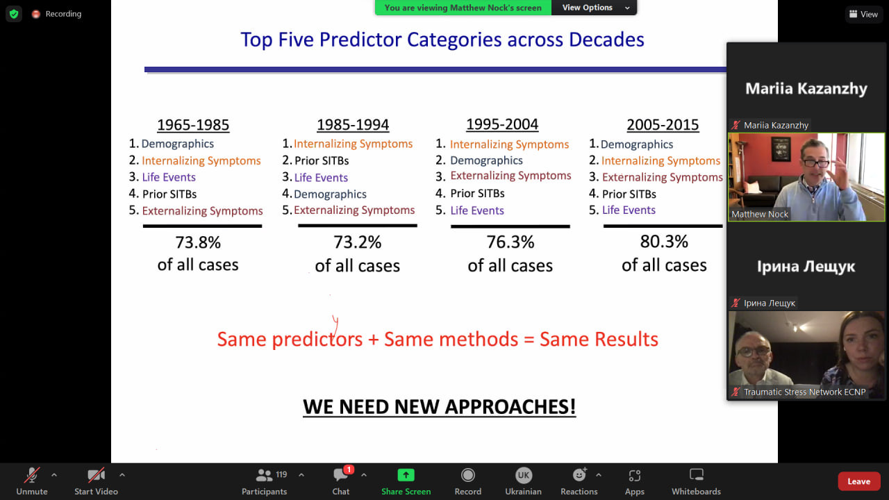 28 вересня 2023 року відбулася віртуальна зустріч з Метью К.Ноком, США, та Андрієм Гайдабрусом, Україна (Мережа травматичного стресу ECNP). На зустрічі обговорювалися останні досягнення у прогнозуванні та профілактиці суїцидальної поведінки. Особливо актуальною ця проблема стає у період війни, коли сам досвід війни є фактором ризику для спроб самогубства – більшість проведених досліджень вказують на це, а також можливі прояви посттравматичного стресового розладу, депресії, тривоги тощо. Обговорювалися питання психологічної роботи та проведення досліджень з означеної проблематики.