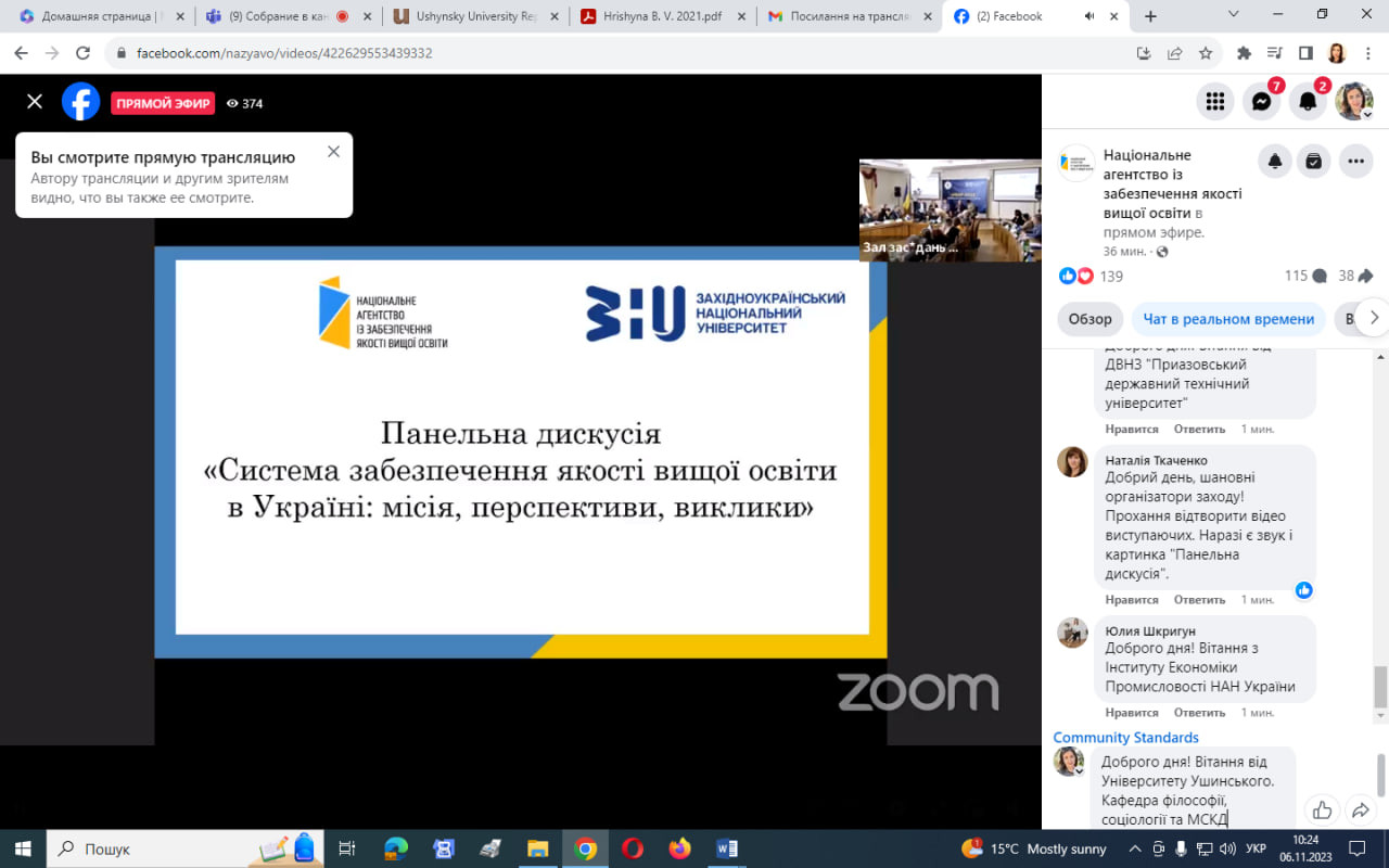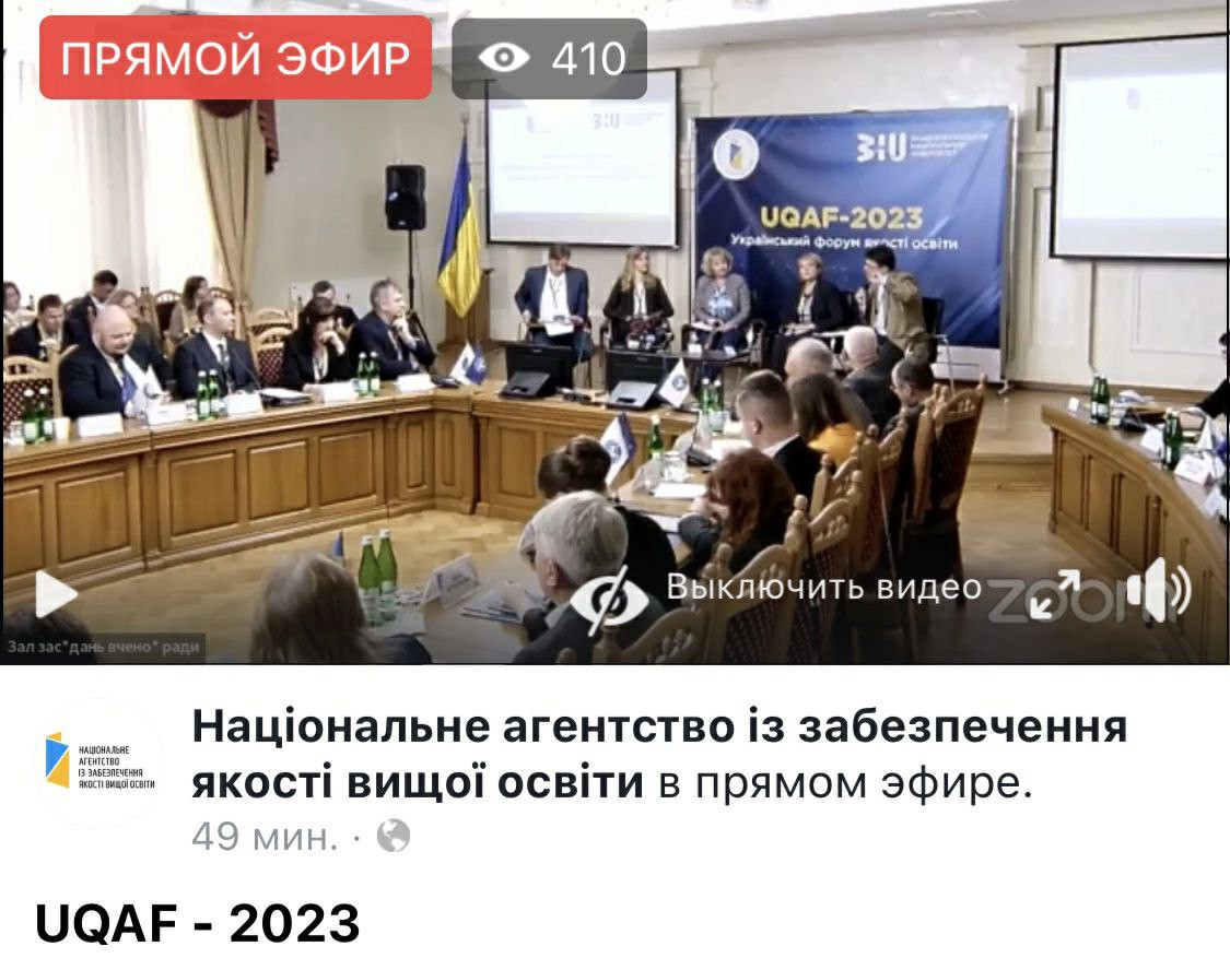 Український форум якості освіти (UQAF – 2023, Ukrainian Quality Assurance Forum), що відбувся 06 листопада 2023 року, організований Національним агентством у партнерстві із Західноукраїнським національним університетом (м. Тернопіль) зібрав учасників з різних куточків України. Панельні дискусії «Система забезпечення якості вищої освіти в Україні: місія, перспективи, виклики», «Навіщо нам постакредитаційний моніторинг», «Яке майбутнє у академічної доброчесності в Україні?» об’єднали науково-педагогічних працівників, здобувачів освіти та всіх охочих. Мали можливість ознайомитись з успішними практиками розбудови внутрішньої системи забезпечення якості вищої освіти в українських закладах вищої освіти (Державний торгівельно-економічний університет, Західноукраїнський національний університет, Національний медичний університет імені О.О. Богомольця та інші). Здобувачі третього (освітньо-наукового) рівня вищої освіти ОНП «Філософія» (Людмила Городнюк, Марина Арапакі, Кіра Білоусова та інші) Гарант ОНП, та члени групи забезпечення долучилися до обговорення важливих дискусійних проблем у дистанційному форматі.