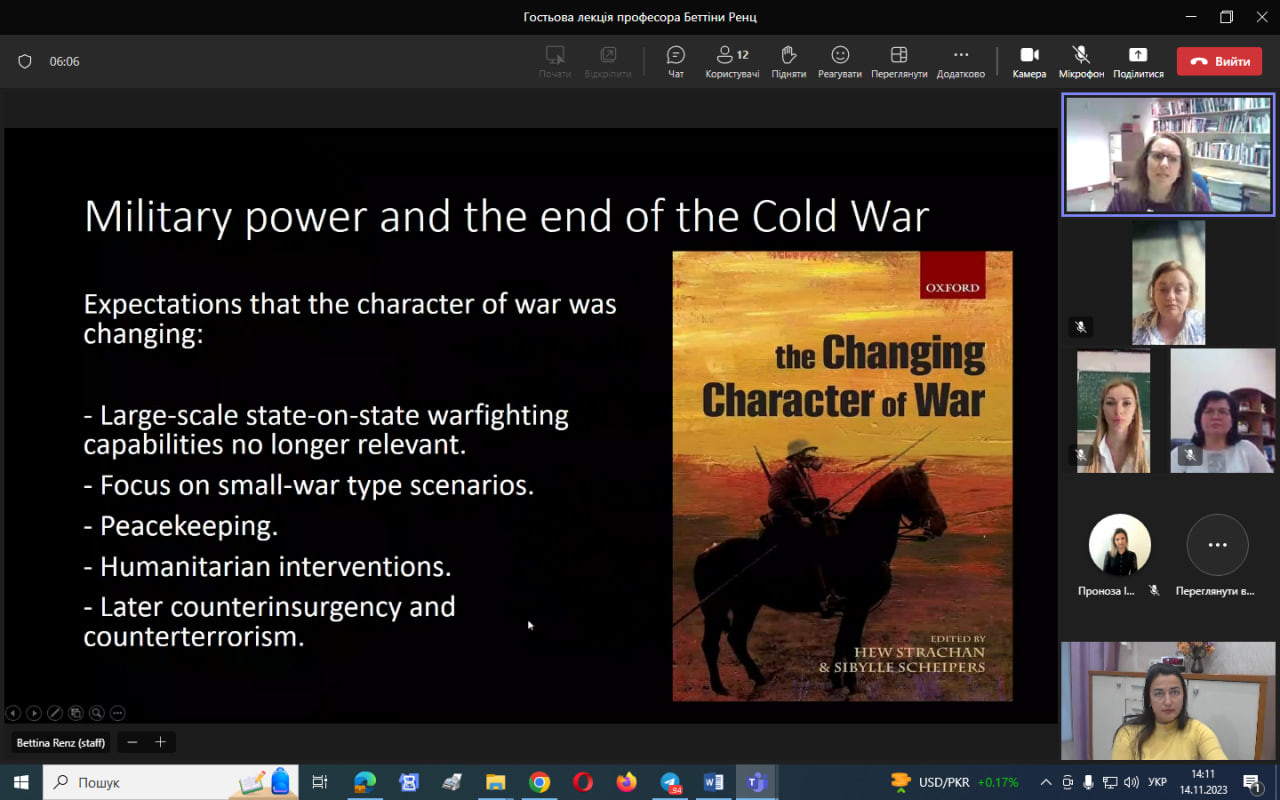 14 листопада 2023 року здобувачі третього (освітньо-наукового) рівня вищої освіти ОНП «Філософія» та Гарант ОНП мали можливість послухати відкриту гостьову лекцію професорки з міжнародної безпеки, Школи політики та міжнародних відносин Ноттінгемського університету (Велика Британія) Беттіни Ренц «Військова сила в ХХІ столітті: протиріччя в західній військовій думці», що проводилась у межах дисципліни «Політичні проблеми міжнародних систем та глобального розвитку (викладач – проф. Світлана Ростецька)», яка викладається для політологів.Надзвичайно актуальна тема в наш час об’єднала всіх небайдужих. Аналіз аспектів соціального насильства, війни та миру, сучасних поглядів на війну крізь призму глобалізації і багатополюсного світу сприяють формуванню уявлень про природу та змістову багатовимірність війни як соціального насильства.