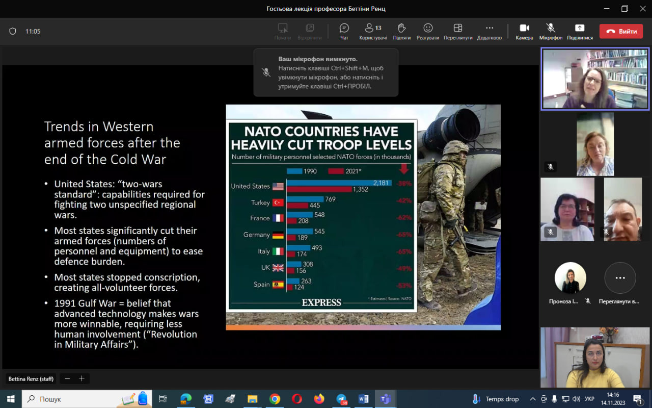 14 листопада 2023 року здобувачі третього (освітньо-наукового) рівня вищої освіти ОНП «Філософія» та Гарант ОНП мали можливість послухати відкриту гостьову лекцію професорки з міжнародної безпеки, Школи політики та міжнародних відносин Ноттінгемського університету (Велика Британія) Беттіни Ренц «Військова сила в ХХІ столітті: протиріччя в західній військовій думці», що проводилась у межах дисципліни «Політичні проблеми міжнародних систем та глобального розвитку (викладач – проф. Світлана Ростецька)», яка викладається для політологів.