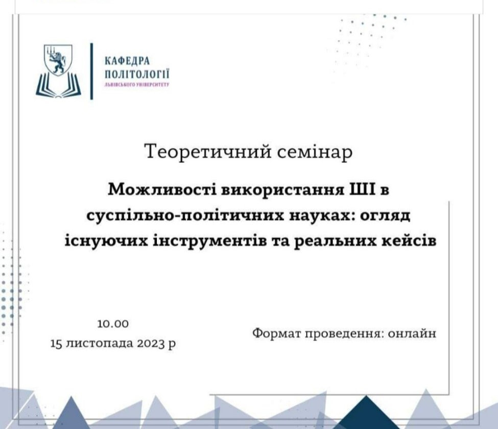 15 листопада 2023 року з ініціативи кафедри політології Львівського національного університету ім. Івана Франка відбувся теоретичний семінар «Можливості використання ШІ в суспільно- політичних науках: огляд існуючих інструментів та реальних кейсів». Були присутні студенти спеціальностей (052 Політологія, 081 Право, 035 Філологія (переклад) та ін).