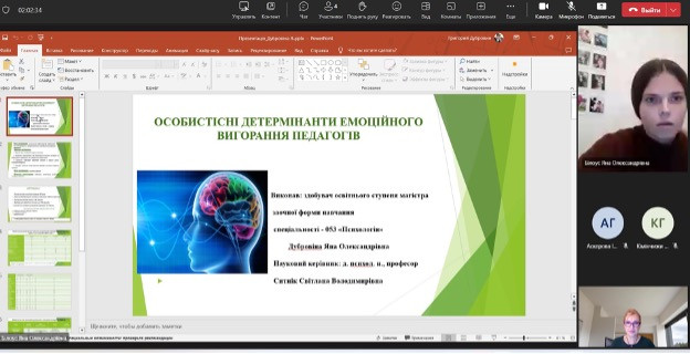 28 листопада відбувся попередній захист магістерських робіт здобувачів вищої освіти другого магістерського рівня заочної форми навчання зі спеціальності 053 «Психологія» на платформі Teams. Усі представлені роботи відповідали належному рівню і допущені до захисту. Роботи здобувачів розглянули широкий спектр проблеми, зокрема емоційного вигоряння, особливості інтернет залежності до гендерного індексу особистості, подолання кризових сімейних станів, особистісної детермінанти поведінки дітей з суїцидною поведінкою, профілактики професійного вигоряння тощо.
