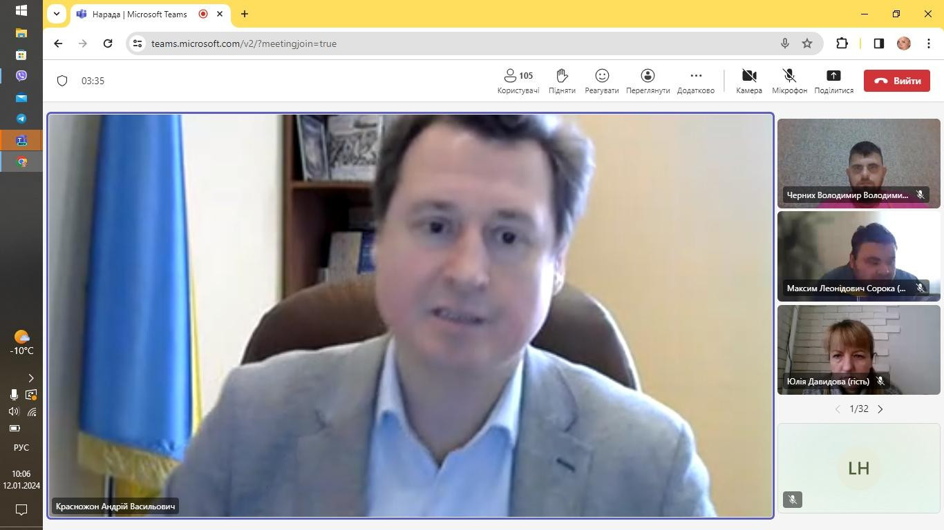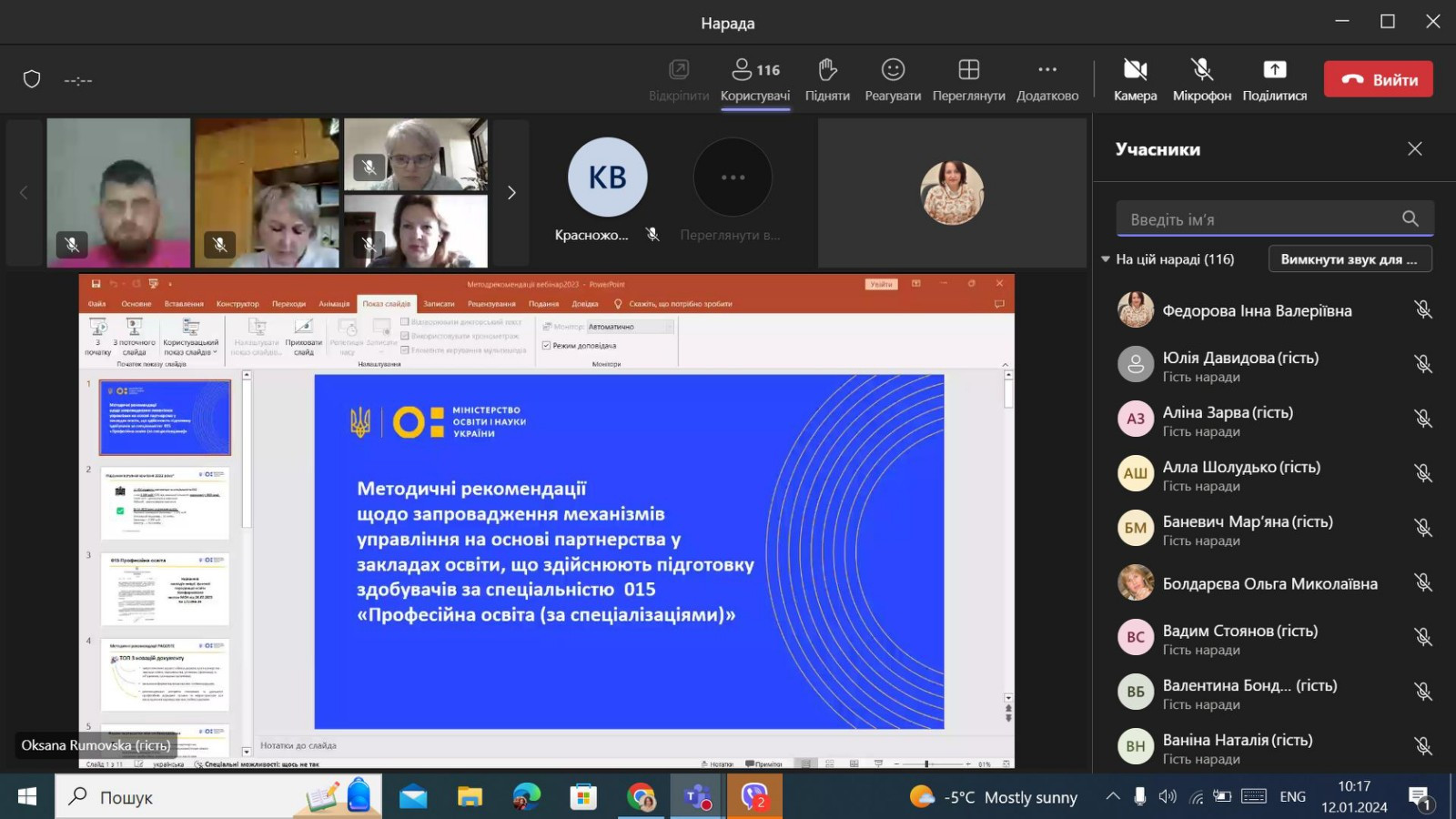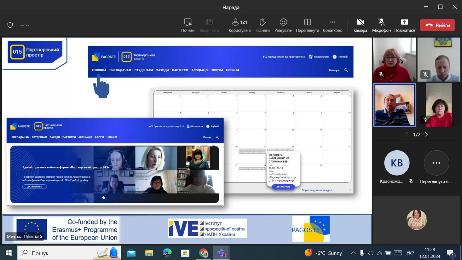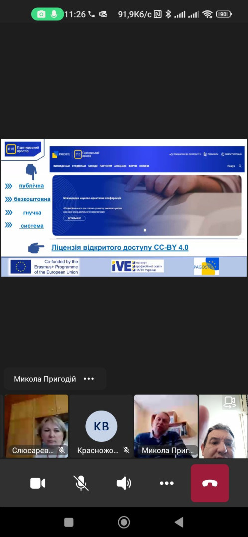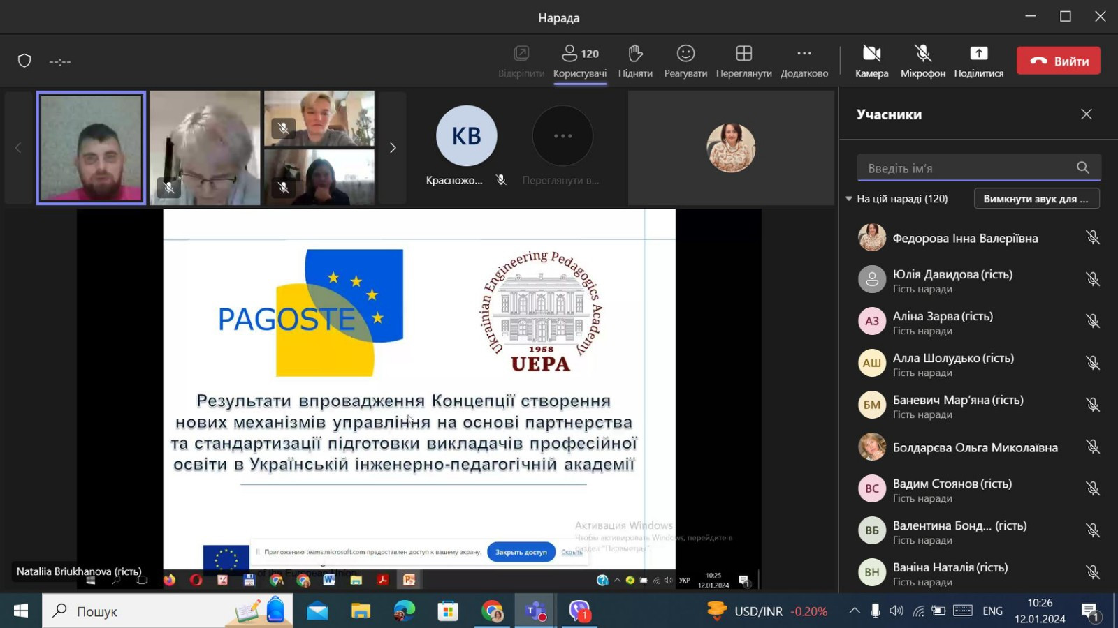 Здобувачі третього (освітньо-наукового) рівня вищої освіти ОНП «Філософія» Людмила Городнюк, Інна Федорова, Ігор Усатюк та Гарант ОНП проф. Оксана Петінова взяли участь у круглому столі «PAGOSTE: Результати та використання.Створення покрокової Інструкції з впровадження партнерського управління для ЗВО України» в межах плану сталого розвитку результатів проєкту Erasmus+ PAGOSTE «Нові механізми управління на основі партнерства та стандартизації підготовки викладачів професійної освіти в Україні», що був проведений 12 січня 2024 року Університетом Ушинського в онлайн форматі. На порядку денному – обговорення цінності робітничих професій у пілявоєнній відбудові країни, інноваційні методичні рекомендації, спрямовані на впровадження механізмів управління на основі партнерства та стандартизації у підготовку викладачів професійної освіти в Україні. Запропоновано онлайн платформу «Партнерський простір 015», що об'єднує заклади вищої освіти, професійної та фахової передвищої освіти, а також роботодавців. Цей інструмент відкриває нові можливості для взаємодії та співпраці між різними галузями освіти та бізнесу. Розглянуто кращі українські та європейські практики впровадження нових механізмів управління на основі партнерства. Захід був надзвичайно цікавим та актуальним в умовах сьогодення.