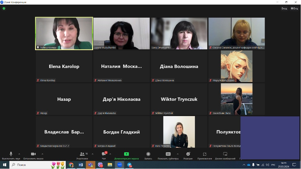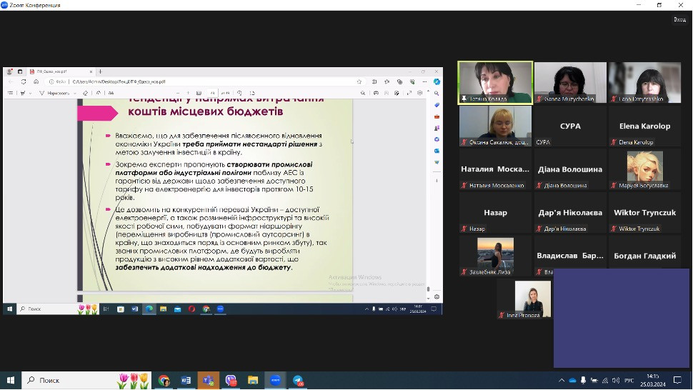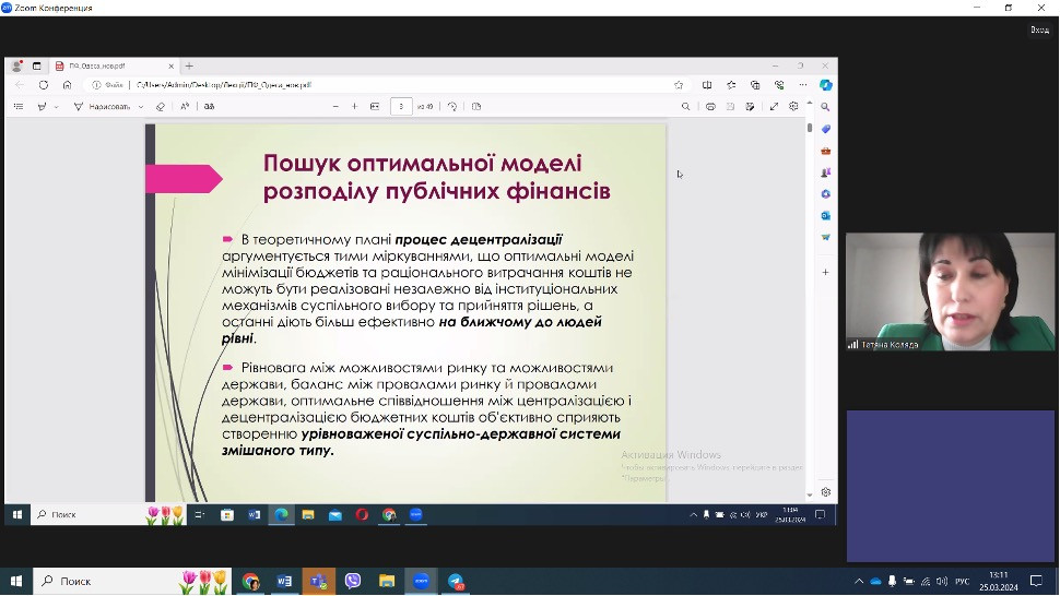 25 березня 2024 року студенти-політологи та викладачі кафедри політичних наук і права Університету Ушинського доєдналися до гостьової лекції кандидата економічних наук, старшого наукового співробітника, доцента кафедри фінансів Державного податкового університету Тетяни КОЛЯДИ на тему «Зростання ролі територіальних громад у формуванні фінансового простору України в умовах децентралізації влади».