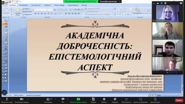 29 березня 2024 року продуктивна дискусія у дискурсі філософії об’єднала студентів, аспірантів різних спеціальностей, викладачів Університету Ушинського та ЗВО-партнерів, зокрема НТУ «Дніпровська політехніка», НУ «Чернігівська політехніка» навколо актуальних питань академічної доброчесності. Спікер – доктор філософських наук, професор, завідувач кафедри філософії, біоетики та іноземних мов Одеського національного медичного університету Володимир Ханжи – презентував тему «Академічна доброчесність: епістемологічний аспект». Гостьова лекція на запрошення Гаранта ОНП «Філософія» проф. Оксани Петінової відбулася в межах проведення Тижня академічної доброчесності Університету Ушинського. Епістемологія як філософсько-методологічна дисципліна досліджує знання як таке, його будову, структуру, функціонування і розвиток. Механізми об'єктивації та реалізації знання в науково-теоретичній і практичній діяльності з точки зору академічної доброчесності предметом дискусії сьогоднішньої зустрічі. Яка ж роль в цьому процесі відводиться верифікації як процедурі встановлення істинності тих чи інших суджень, підтвердження теоретичного знання та фальсифікації, коли вчений замість пошуку всіх прикладів, що підтверджують гіпотезу, виявляє один-єдиний випадок, який спростовує її? Ці та інші питання стали предметом творчого обговорення освітян Одеси, Дніпра та Чернігова.