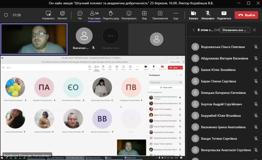 До участі у заході також було запрошено старшого викладача кафедри прикладної математики та інформатики В.А.Корабльова, який презентував доповідь за темою « Штучний інтелект та академічна доброчесність».