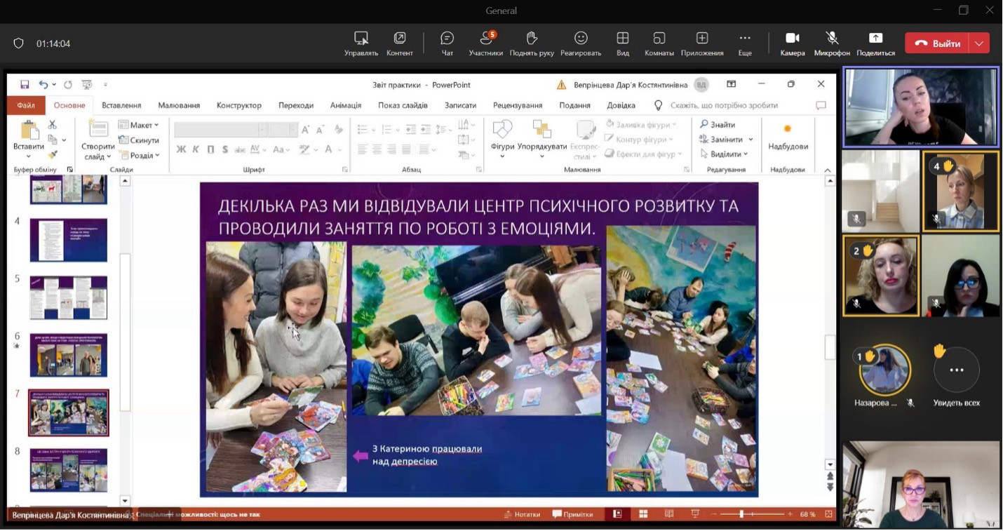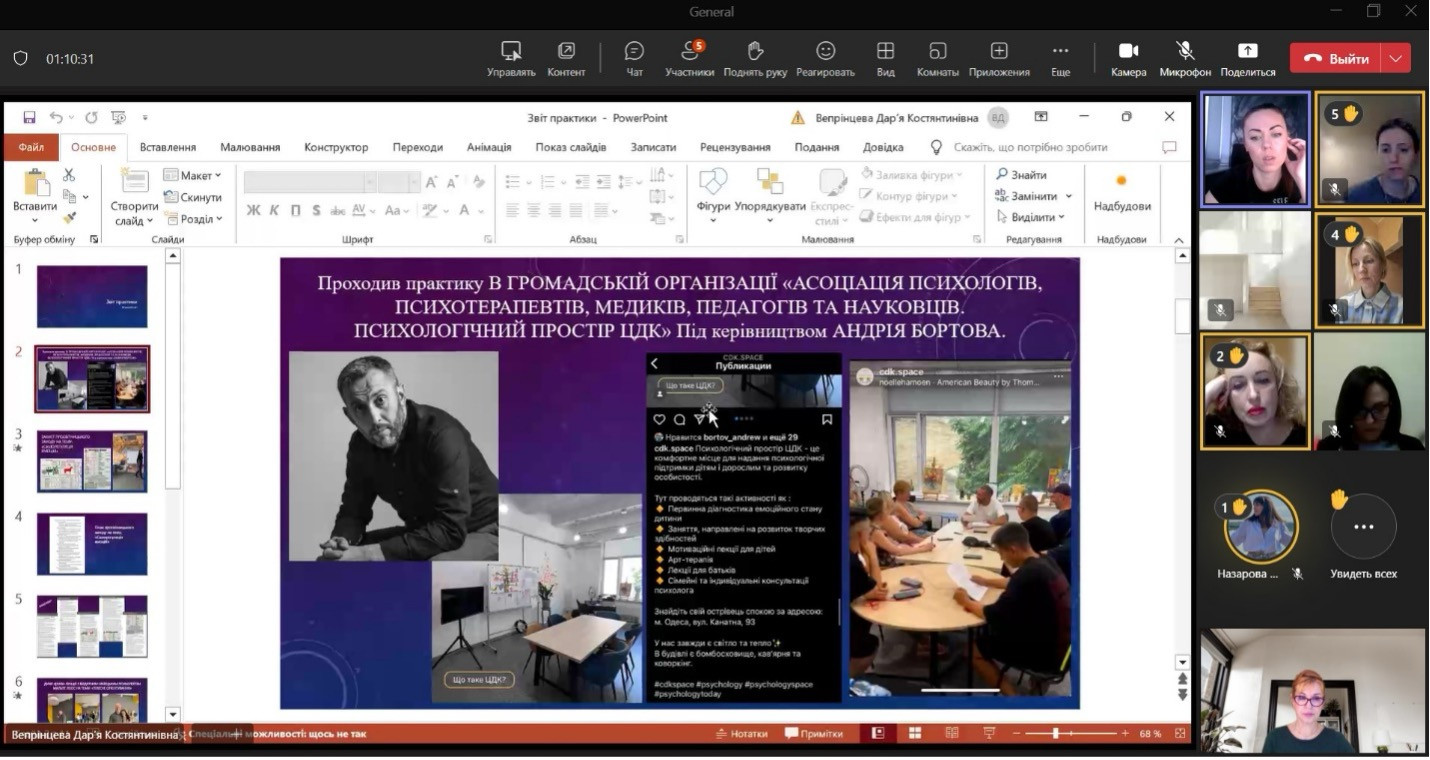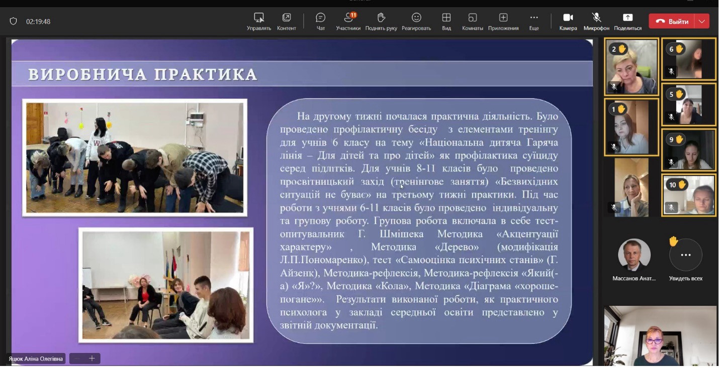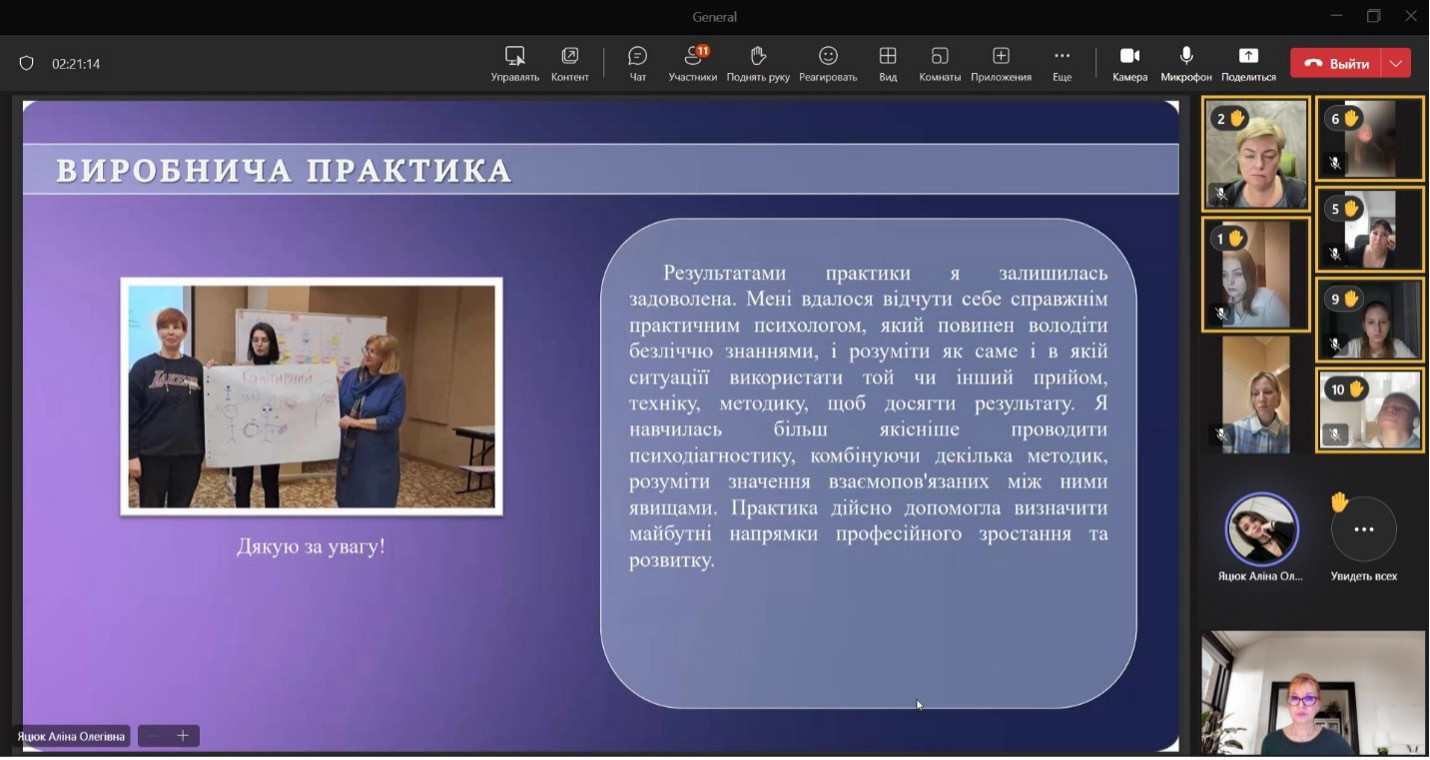 27-28 березня 2024 року було проведено підсумкову конференцію з виробничої практики (психологічного практикування) для магістрів першого курсу денної та заочної форм навчання за ОПП «Практична психологія. Екстремальна та кризова психологія». Головної метою проходження такої практики було закріплення теоретичних знань та набуття практичних навичок роботи психолога в екстремальних та кризових ситуаціях.Під час проходження практики у здобувачів було сформовано навички різних видів просвітницької, організаційної роботи, виконання індивідуально-навчального дослідного завдання, психодіагностики, психотерапії, психокорекції тощо. Також було сформовано певні професійні компетенції майбутніх фахівців, вони здобули необхідні знання у таких сферах, як психосоматична допомога під час стресу, ресурсні практики арттерапії, психологічна допомога дітям тощо. Здобувачі отримали індивідуальні та групові консультації своїх керівників від баз практики. Протягом проходження практики магістри відвідали наступні заходи: лекцію «Робота психолога з залежними», «Цілеспрямованість та мотивація: розкрийте свій потенціал», «Ідентифікація себе і її вплив на поведінку і оточення»; лекцію на тему «Взаємозв’язок тілесних і когнітивних реакцій, спікер Мальте Лоос (Німеччина) системний психотерапевт «Inner stille» (м. Берлін); тренінгові заняття «Впевненість у собі та довіра до себе», «Конфлікт: види і способи подолання»; практичне заняття з підлітками, що живуть з цукровим діабетом в рамках співпраці з Дитячим консультативно-діагностичним центром імені академіка Б.Я. Резніка. Як зауважили учасники конференції, їм вдалося відчути себе справжніми практичними психологами, оволодіти відповідними професійними компетенціями, віднайти напрямки власного професійного зростання.