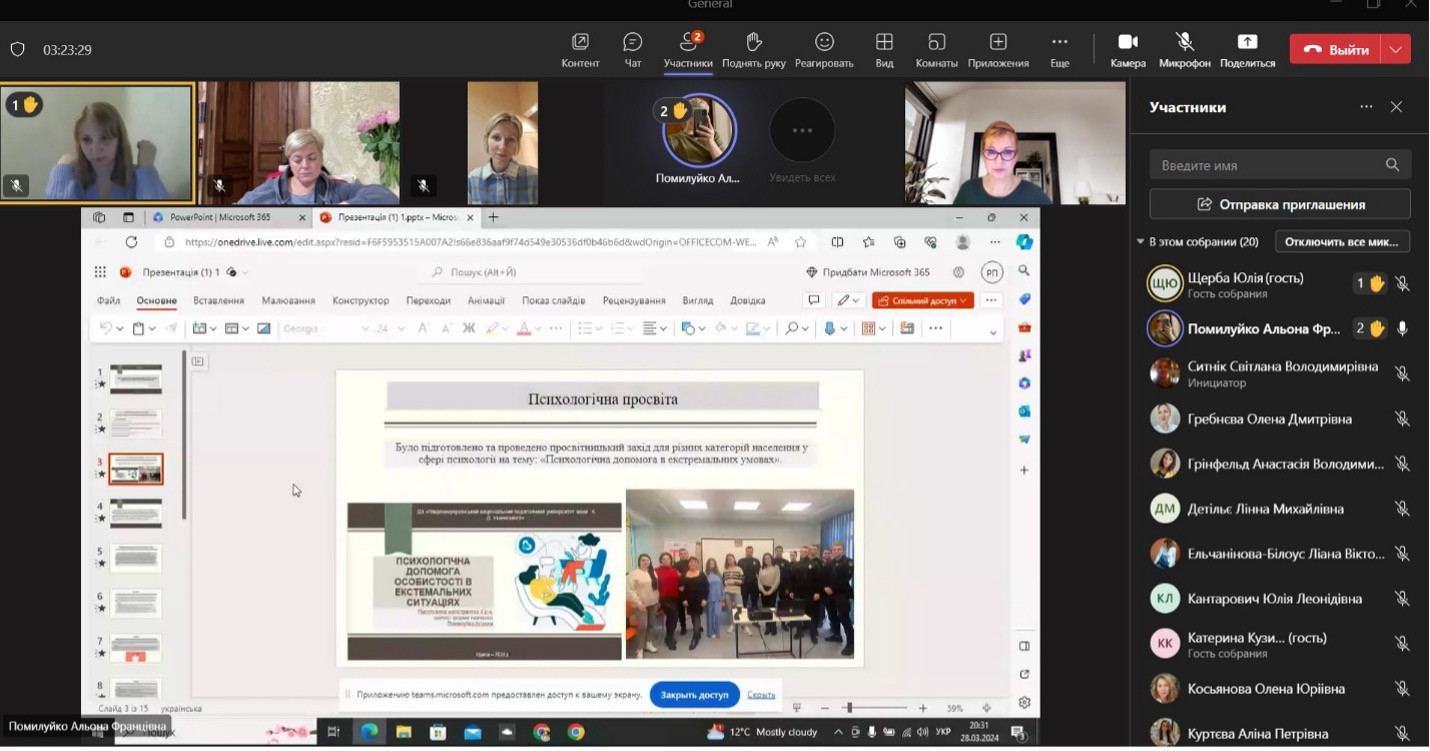 27-28 березня 2024 року було проведено підсумкову конференцію з виробничої практики (психологічного практикування) для магістрів першого курсу денної та заочної форм навчання за ОПП «Практична психологія. Екстремальна та кризова психологія». Головної метою проходження такої практики було закріплення теоретичних знань та набуття практичних навичок роботи психолога в екстремальних та кризових ситуаціях.