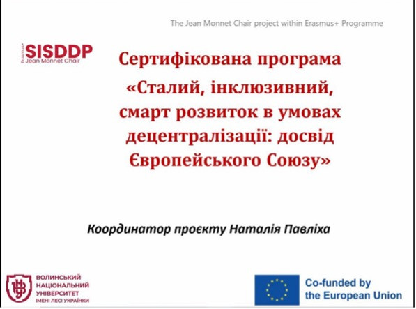 Здобувачі третього (освітньо-наукового) рівня вищої освіти ОНП «Політологія» Юлія МУЖЕЛЯК та Юрій ПРОКОПЕНКО разом з гарантом програми Ганною МУЗИЧЕНКО успішно завершили навчання в зимовій докторській школі 2024 за темою «Сталий, інклюзивний та смарт розвиток в контексті децентралізації: досвід ЄС». Докторська школа проходила у Волинському національному університеті імені Лесі Українки та реалізовувалася у межах міжнародного проєкту ERASMUS+ Jean Monnet Chair “Sustainable, Inclusive and Smart Development within Decentralization Process: the EU experience” (101047894-SISDDP-ERASMUS-JMO-2021-HEI-TCH-RSCH for 2022-2025). Під час навчання ознайомились з розробкою стратегій та проєктів сталого, інклюзивного, смарт-розвитку на рівні країни, регіону, громади, бізнесу, з технологіями проєктного та муніципального менеджменту; розглянули особливості стратегічного управління та планування, аналізували питання ухвалення рішень в громаді, вчилися комунікувати та покращувати владно-громадську взаємодію в умовах реформи децентралізації. Учасники програми успішно виконували всі завдання та тестування, а також підготували підсумкові есе за тематикою докторської школи. Навчання в докторській школі та отримані сертифікати стануть підставою для зарахування здобувачам модулю з дисципліни «Регіональна політика і локальна демократія», а також стануть в нагоді при написанні дисертаційних досліджень аспірантів.