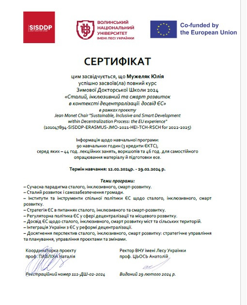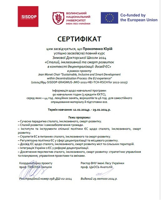Здобувачі третього (освітньо-наукового) рівня вищої освіти ОНП «Політологія» Юлія МУЖЕЛЯК та Юрій ПРОКОПЕНКО разом з гарантом програми Ганною МУЗИЧЕНКО успішно завершили навчання в зимовій докторській школі 2024 за темою «Сталий, інклюзивний та смарт розвиток в контексті децентралізації: досвід ЄС». Докторська школа проходила у Волинському національному університеті імені Лесі Українки та реалізовувалася у межах міжнародного проєкту ERASMUS+ Jean Monnet Chair “Sustainable, Inclusive and Smart Development within Decentralization Process: the EU experience” (101047894-SISDDP-ERASMUS-JMO-2021-HEI-TCH-RSCH for 2022-2025).