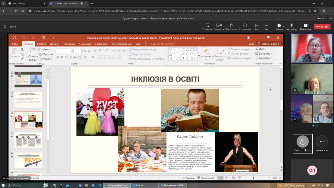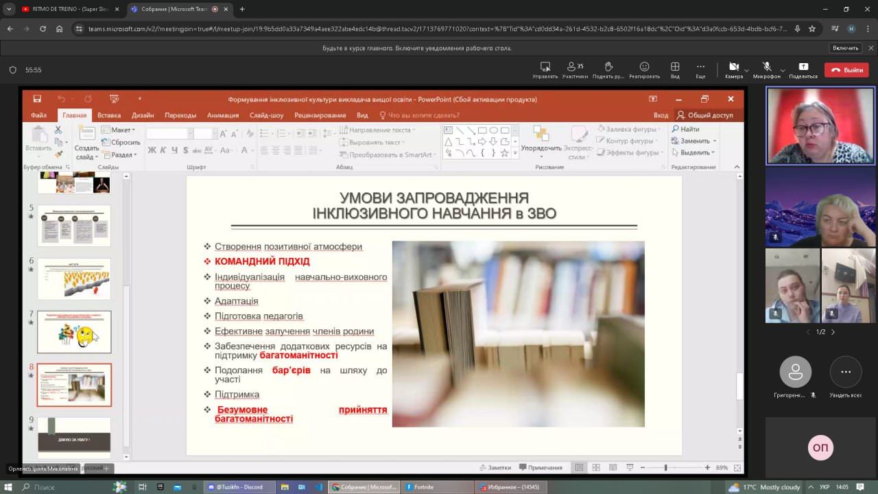 24 квітня 2024 року на запрошення кафедри педагогіки Університету Ушинського аспіранти ОНП «Філософія» разом з Гарантом проф. Оксаною Петіновою, члени наукового гуртка «Південноукраїнські наукові студії», студенти 2-го року навчання факультету початкового навчання долучилися до відкритої онлайн-лекції «Формування інклюзивної культури викладача вищої освіти». Спікерка - докторка філософії, завідувачка Одеського обласного центру підтримки інклюзивної освіти КЗВО «Одеська академія неперервної освіти Одеської обласної ради» Ірина Орленко. Лекція організована на базі наукової лабораторії кафедри педагогіки «Інновації в освіті».Говорили про інклюзію в освіті, про сприятливе навчальне середовище для розвитку особистості, про бар’єри у спілкування у дітей з особливими освітніми потребами, тощо. Тема викликала жваву дискусію та коментарі. Активну участь в обговоренні взяли Інна Федорова, Віолета Світлицька, Григоренко Анастасія та Барт Аліна. Тема зустрічі надзвичайно актуальна, адже розвиток сучасного суспільства України і процеси інтеграції в європейську спільноту гостро ставлять питання забезпечення соціального захисту громадян країни, і особливо тих, хто потребує його найбільше, зокрема, це діти з особливими освітніми потребами. Побудова ефективної системи інклюзивної освіти в Україні можлива на основі взаємодії різних факторів, насамперед, посилення фінансування освіти, удосконалення її нормативно-правового забезпечення, поліпшення методичного та кадрового забезпечення інклюзивної освіти.