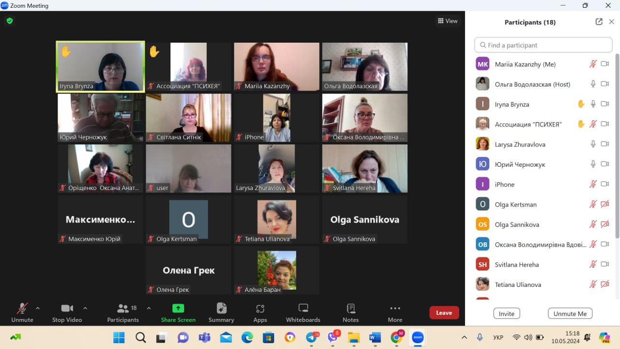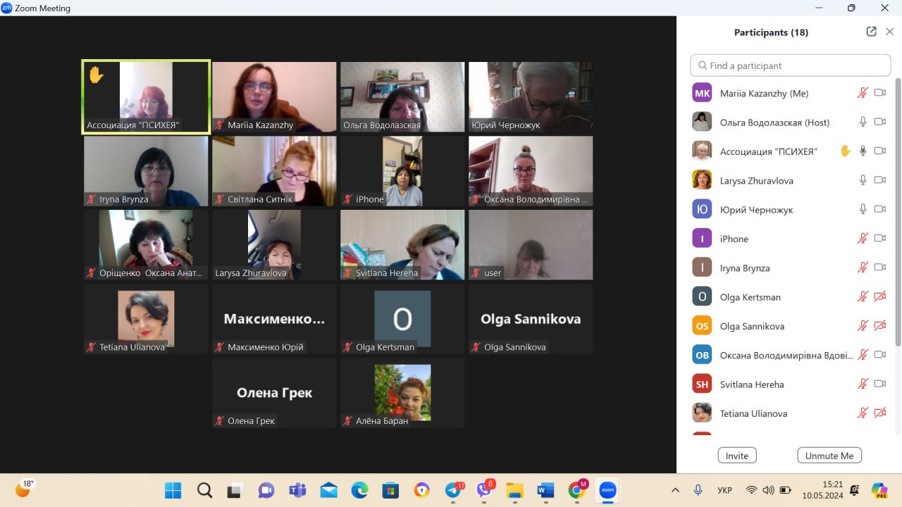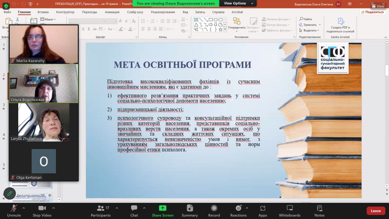 Спікери зустрічі: Марія КАЗАНЖИ, доктор психологічних наук, професор, завідувачка кафедри загальної та диференціальної психології і Ольга ВОДОЛАЗСЬКА – кандидат психологічних наук, доцент, доцент кафедри загальної та диференціальної психології, гарант освітньо-професійної програми «Прикладна і практична психологія». У зустрічі активну участь взяли Оксана ВДОВІЧЕНКО, декан соціально-гуманітарного факультету, доктор психологічних наук, професор; члени кафедри загальної та диференціальної психології у повному складі; члени кафедри теорії та методики практичної психології. До участі у обговоренні було запрошено представників академічної спільноти: Ларису ЖУРАВЛЬОВУ, доктора психологічних наук, професора, академіка НАН вищої освіти України, завідувача кафедри психології Поліського національного Університету; Антоніну КІЧУК, доктора психологічних наук, доцента, доцента кафедри загальної та практичної психології Ізмаїльського державного гуманітарного університету. Також в онлайн-зустрічі взяли участь стейкголдери-практики: Гертруда ШПАТАКОВСЬКА – президент асоціації «Психея»; Світлана ГЕРЕГА – директор Комунальної Установи «Одеський інклюзивно-ресурсний центр №5»; Олена ГАЙВОРОНСЬКА – директор психолого-консультаційного Центру.