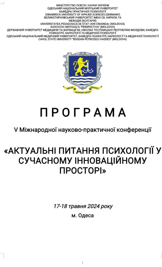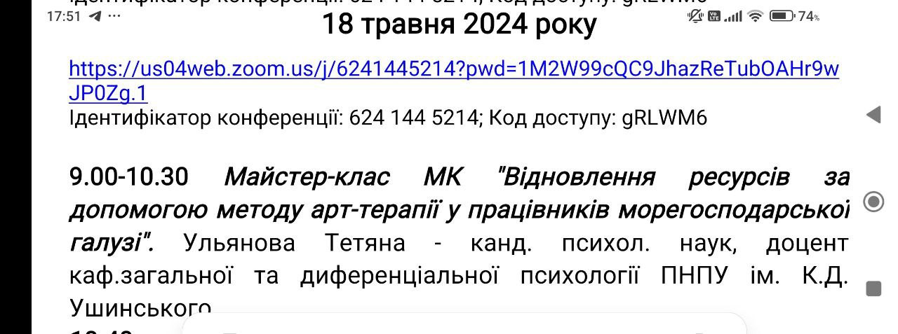18 травня 2024 року в Одеському національному морському університеті в межах V Міжнародної науково-практичної конференції «Актуальні питання психології у сучасному інноваційному просторі» відбувся майстер-клас «Відновлення ресурсів за допомогою методу арт-терапії у працівників морегосподарської галузі».
