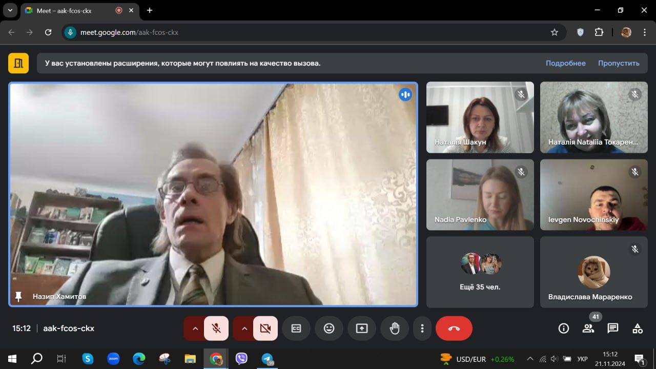 На запрошення кафедри філософії і суспільних наук НУ «Чернігівська політехніка» (ЗВО-партнер) з нагоди Всесвітнього дня філософії Гарант ОНП «Філософія» проф. Оксана Петінова, член робочої групи проф. Зоя Атаманюк, здобувачі третього (освітньо-наукового) рівня вищої освіти ОНП «Філософія» та ОНП «Професійна освіта», докторанти кафедри Ольга Гончарова та Наталія Рибка, здобувачі першого (бакалаврського) рівня вищої освіти спеціальності 013 «Початкова освіта» (12,13,14 групи) та аспіранти різних спеціальностей Міжнародного гуманітарного університету (ЗВО-партнер) долучилися до публічної лекції члена-кореспондента НАН України, почесного професора НУ «Чернігівська політехніка», доктора філософських наук, професора Назіпа Хамітова. На лекції була також презентована книга «Філософія науки і культури: словник», написана міжнародним авторським колективом, обговорювали книгу «Війна в Україні і новий гуманізм: Давид проти Голіафа». Професор Хамітов підкреслив ключову роль філософії у складний час війни та глобальних змін, закликаючи до нових гуманістичних підходів. Захід став чудовою нагодою для здобувачів освіти обговорити фундаментальні філософські питання та долучитися до діалогу з одним із провідних мислителів сучасності. Презентація книг та подальша дискусія сприяли формуванню важливих компетентностей, таких як критичне мислення, комунікація та науковий аналіз. Лекція не лише надихнула на подальші наукові пошуки, а й стала нагадуванням про важливість філософії у формуванні суспільного гуманізму та підтримці духовних цінностей в умовах викликів, з якими стикається Україна.